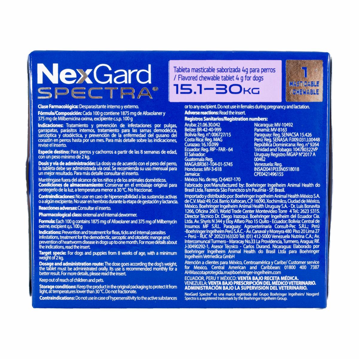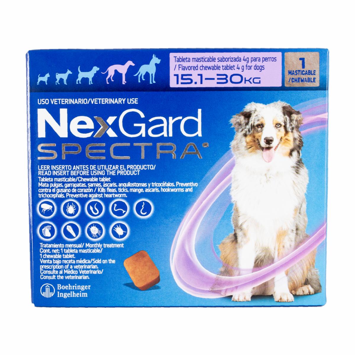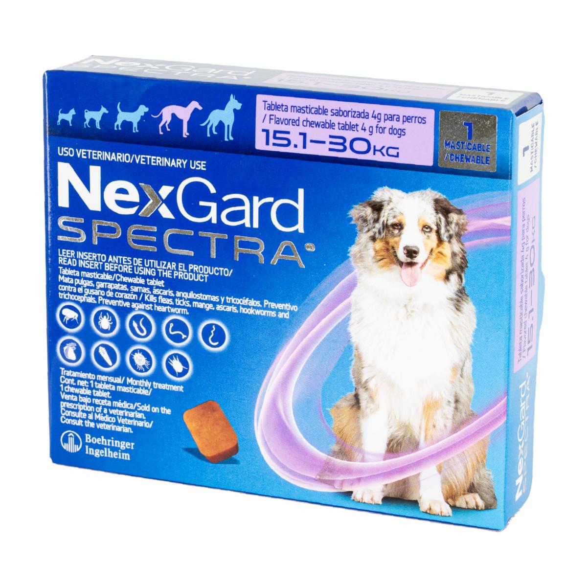 - El antiparasitario para perros en tableta masticable NexGard Spectra en la presentación "Large" con 4 gramos es un producto diseñado para proteger a los perros de tamaño grande de una amplia variedad de parásitos