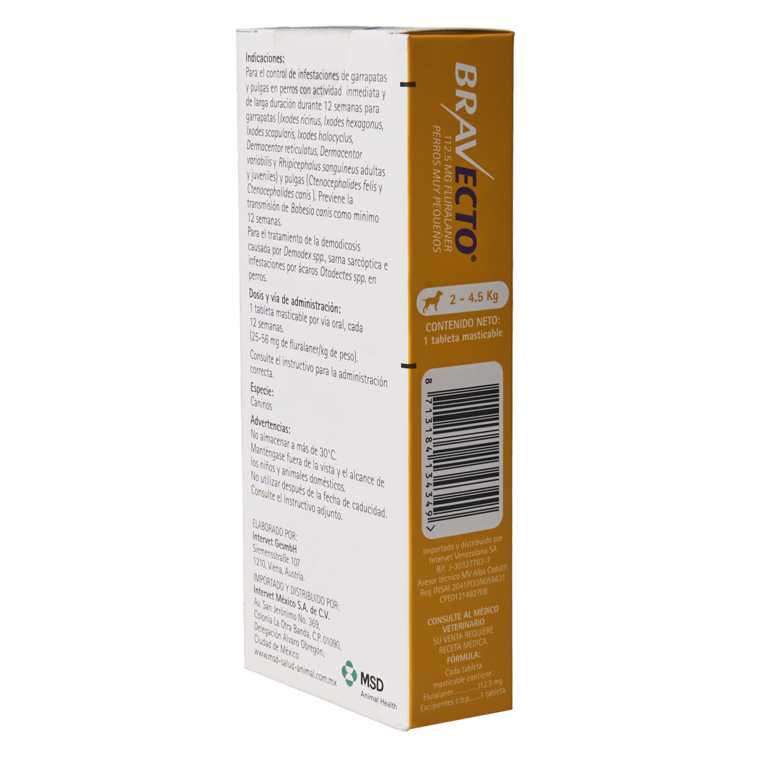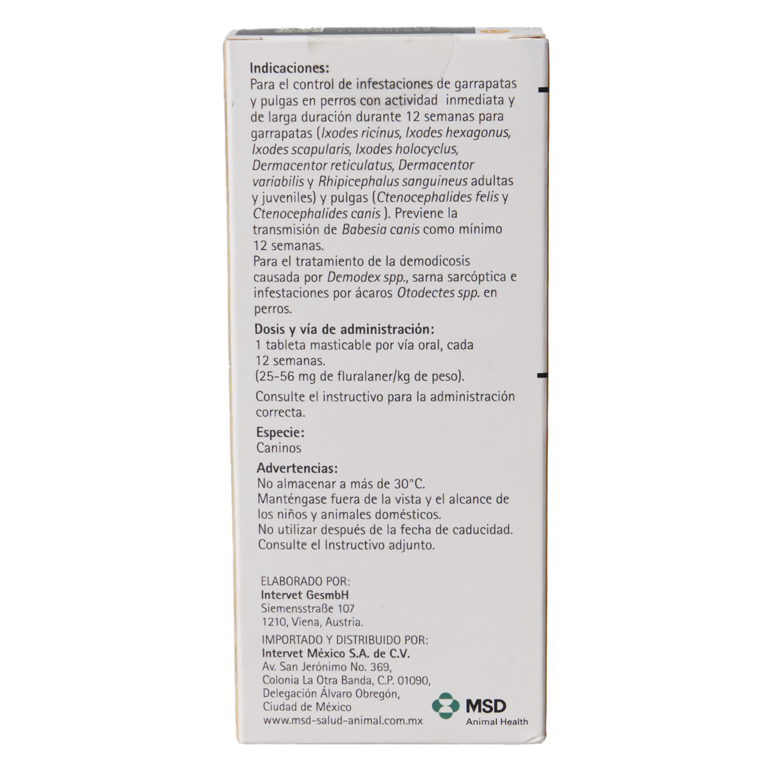 - Es de acción sistémica y actúa en forma inmediata persistiendo durante 12 semanas para matar garrapatas (Ixodes ricinus y Rhipicephalus sanguineus adultas y juveniles) y pulgas (Ctenocephalides felis y Ctenocephalides canis). Su componente principal es Fluralaner