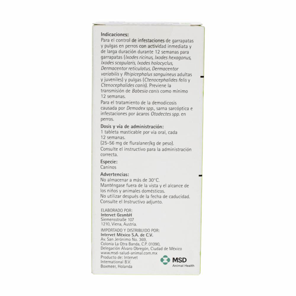 Es de acción sistémica y actúa en forma inmediata persistiendo durante 12 semanas para matar garrapatas (Ixodes ricinus y Rhipicephalus sanguineus adultas y juveniles) y pulgas (Ctenocephalides felis y Ctenocephalides canis). Su componente principal es Fluralaner