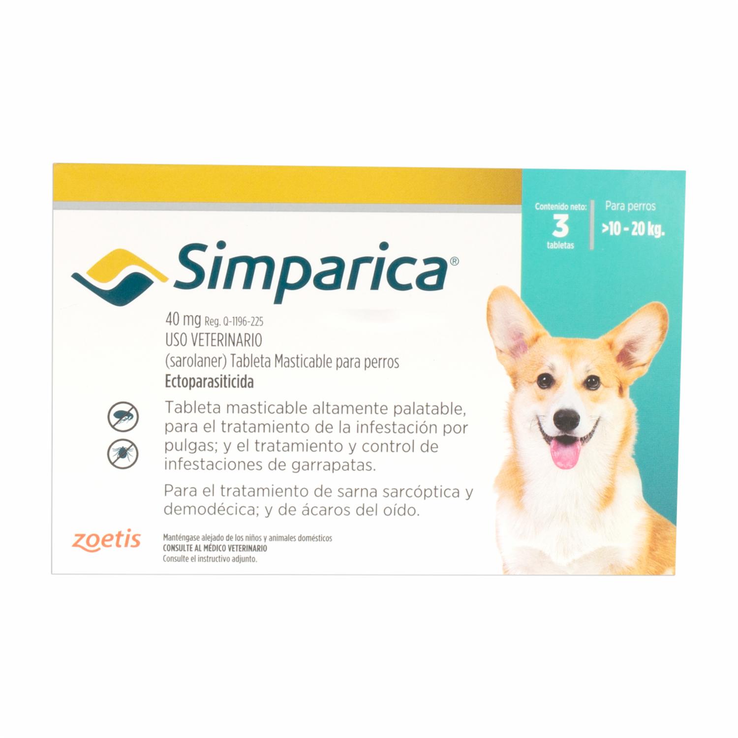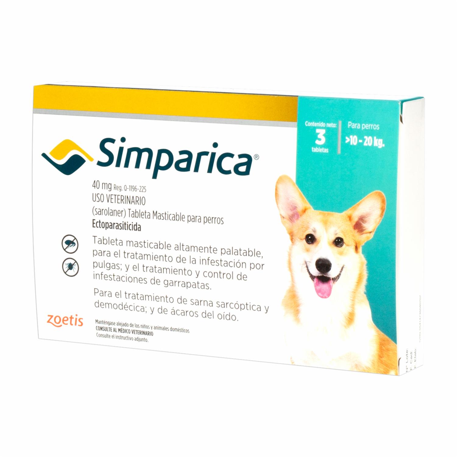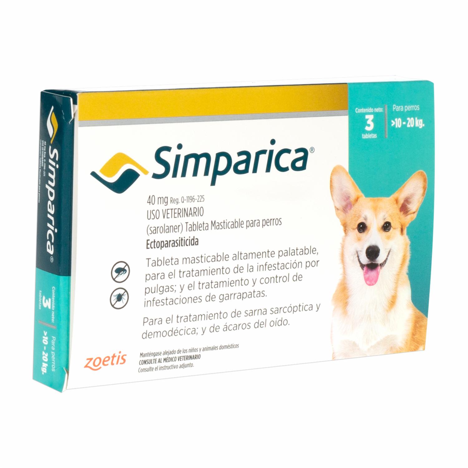 • Las tabletas masticables Simparica en su presentación para perros de 10-20 kg, de color turquesa y de la marca ZOETIS, son un medicamento veterinario utilizado para el control de pulgas y garrapatas en perros