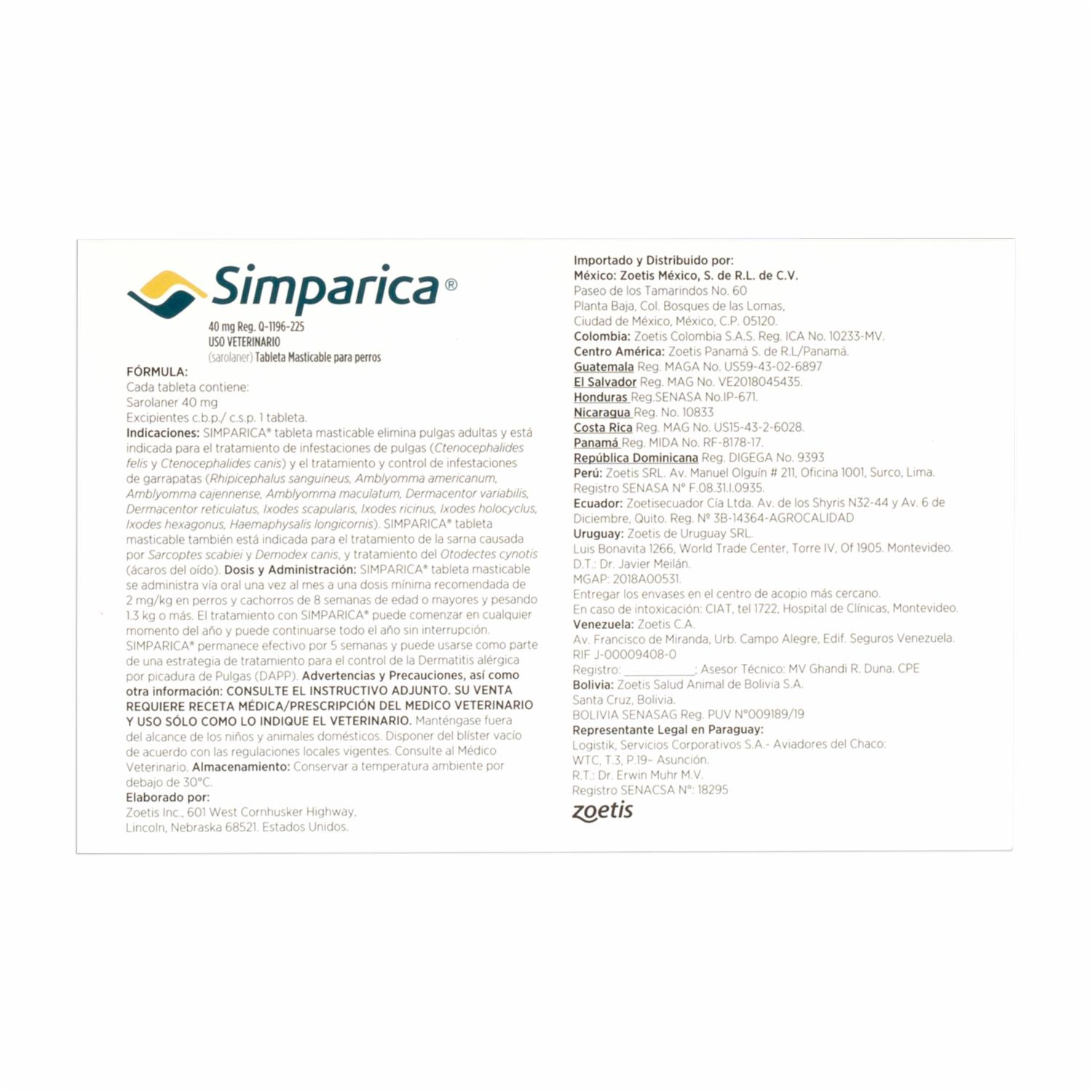 • Simparica contiene el ingrediente activo sarolaner, que proporciona una protección efectiva y duradera contra estos parásitos externos