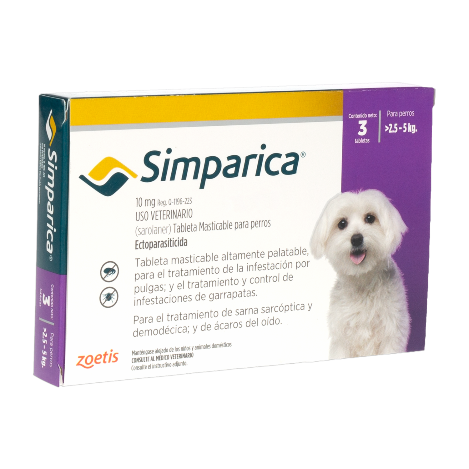 - Las tabletas masticables Simparica en su presentación para perros de 2,5-5 kg, de color lila y de la marca ZOETIS, son un medicamento veterinario utilizado para el control de pulgas y garrapatas en perros
