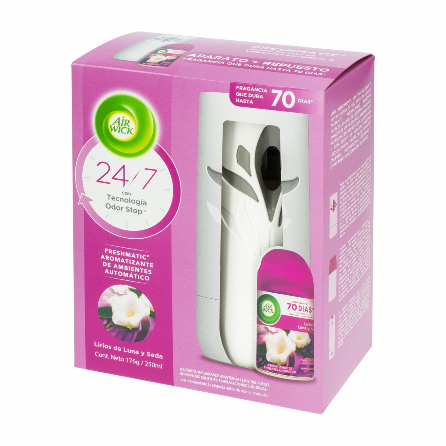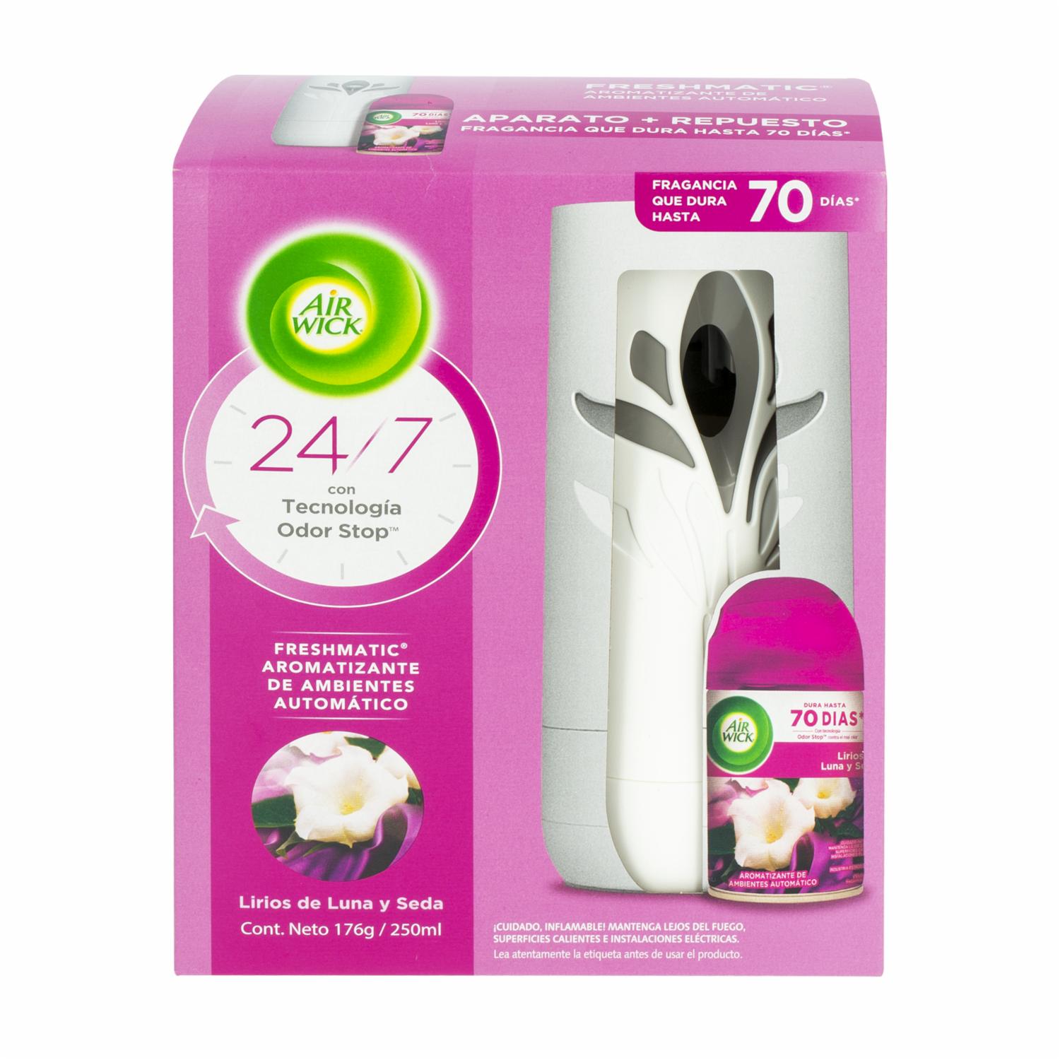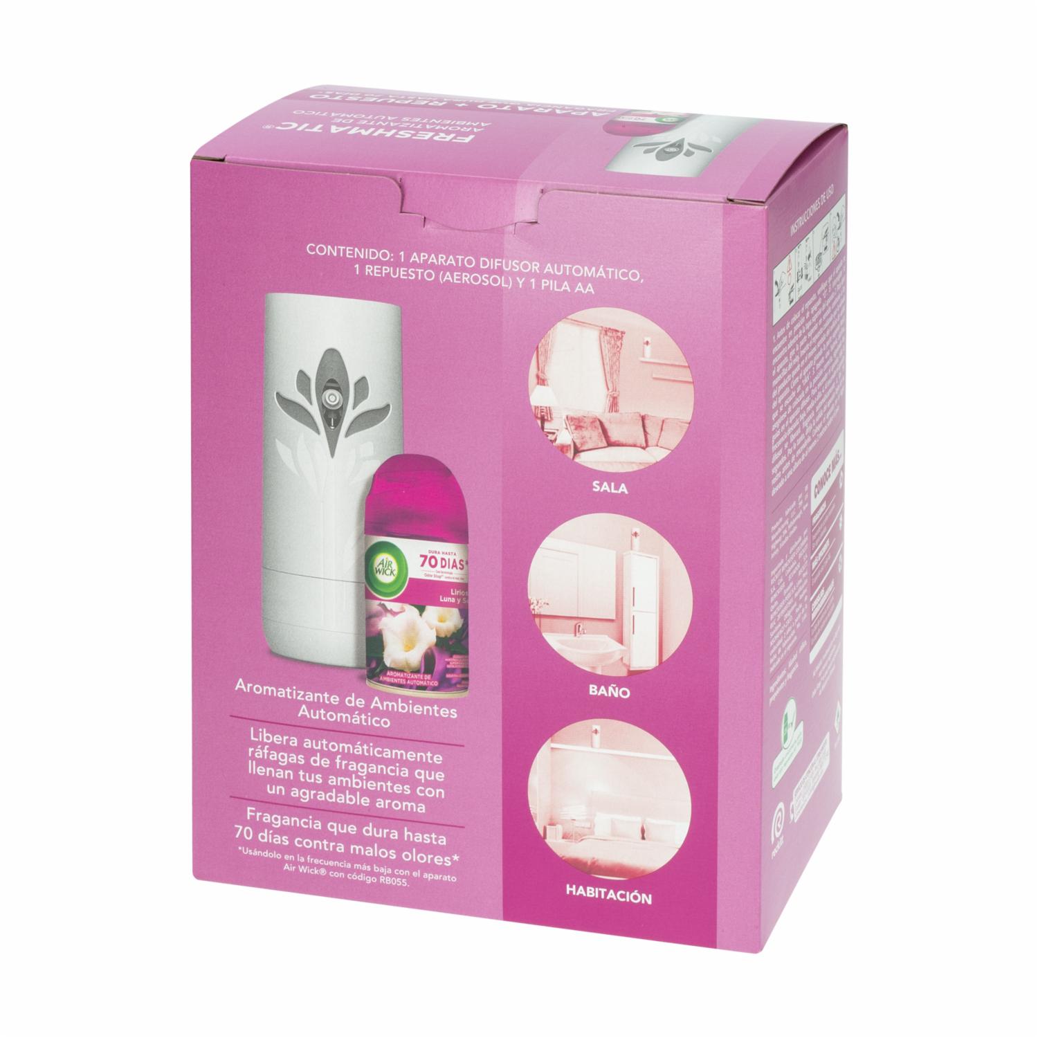 - Aparato + repuesto Lirios de Luna Ambiental, con fragancia duradera que permanece hasta 70 días. Perfecto para mantener tu hogar con un ambiente fresco y agradable por más tiempo