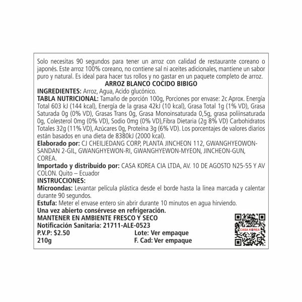 Bibigo Arroz al Vapor (pre cocido), listo en 90 segundos