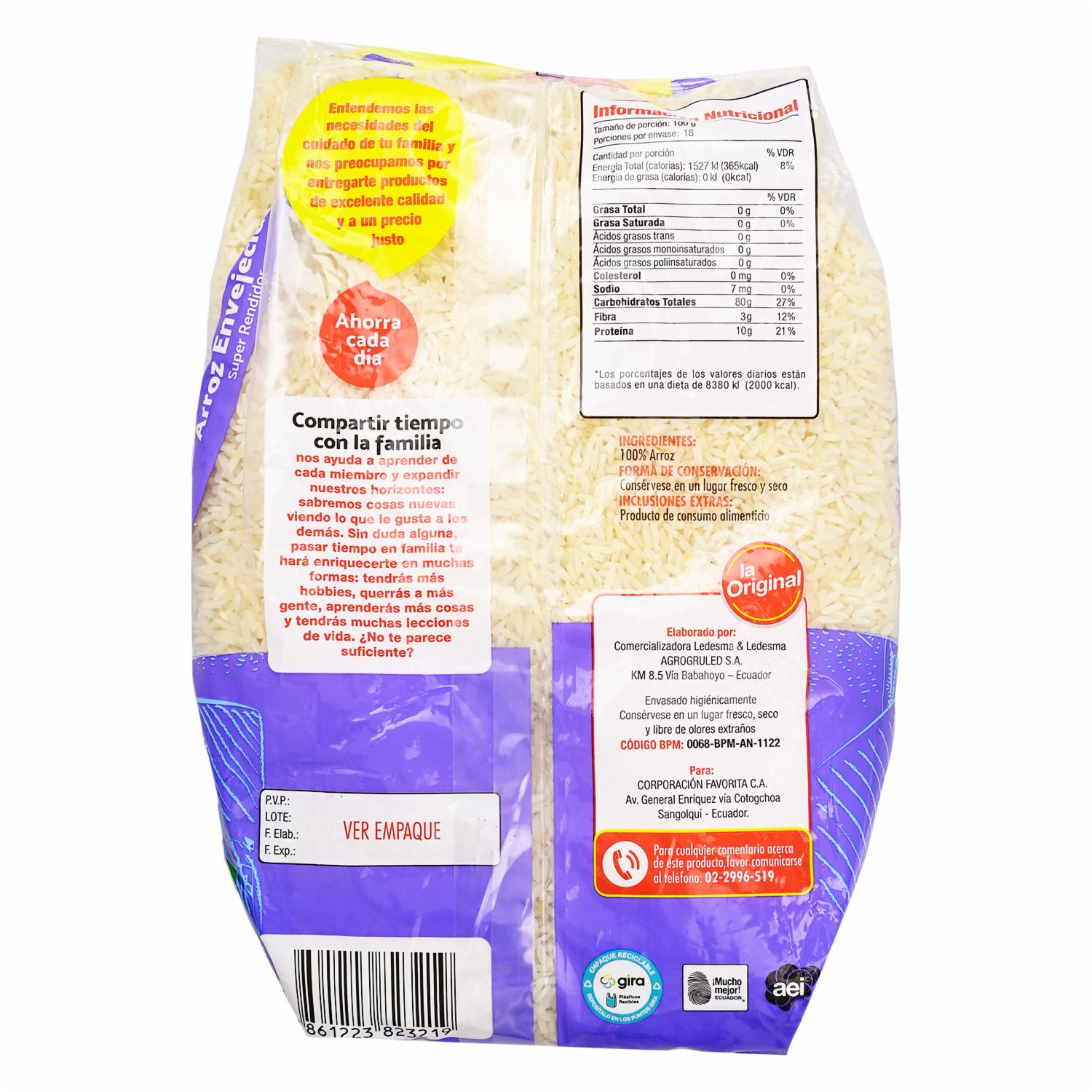 Arroz de grano largo envejecido que se cocina suelto y con excelente textura. Perfecto para comidas diarias o preparaciones especiales por su gran rendimiento. Fácil de preparar y siempre delicioso. Características: Grano envejecido naturalmente para mejor cocción No se apelmaza ni se bate Fuente natural de energía Bajo contenido de grasa Empaque duradero y fácil de almacenar