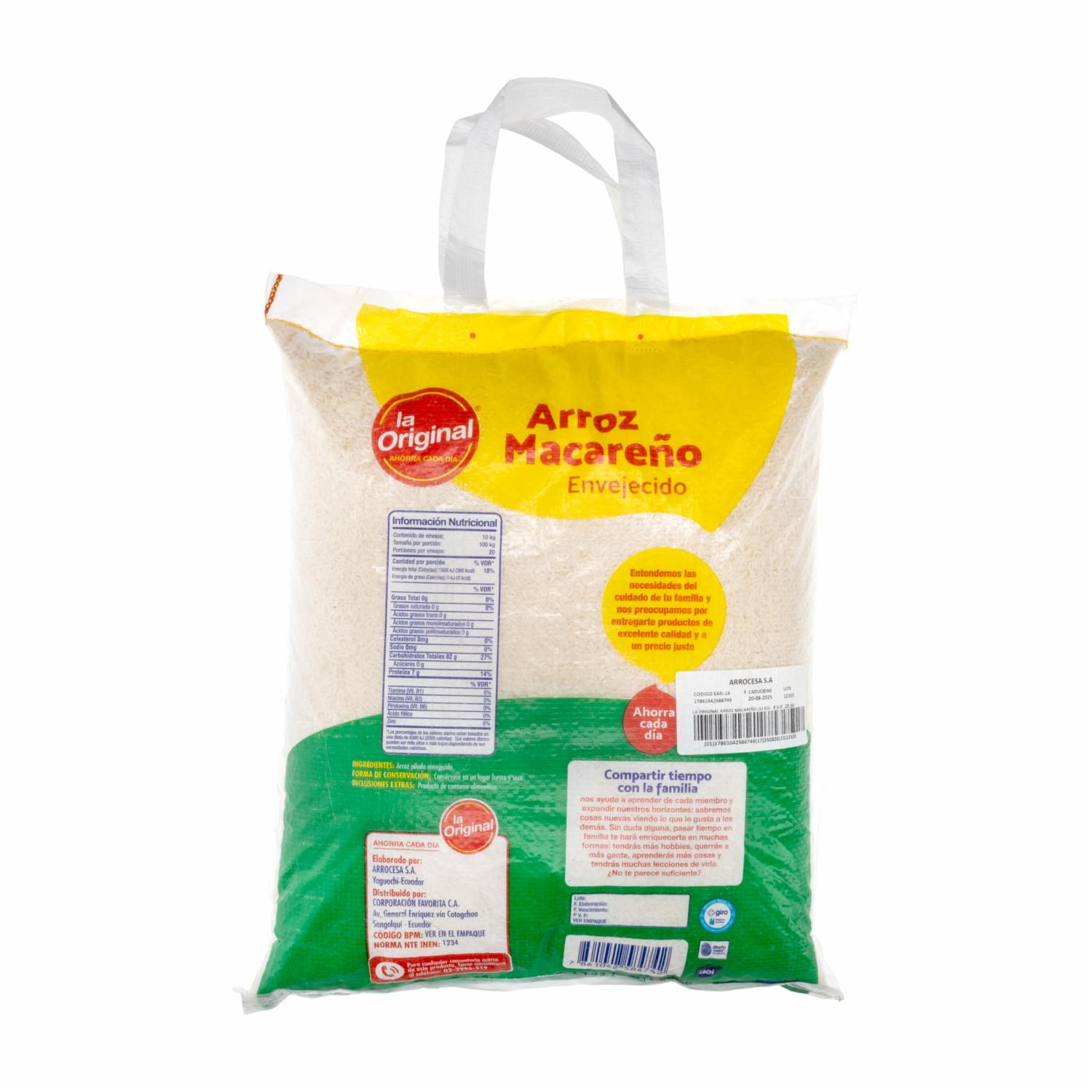 Arroz Blanco Macareño LA ORIGINAL 10 Kg – LA ORIGINAL. Disponible en nuestros locales. Precio y stock pueden variar según la tienda.