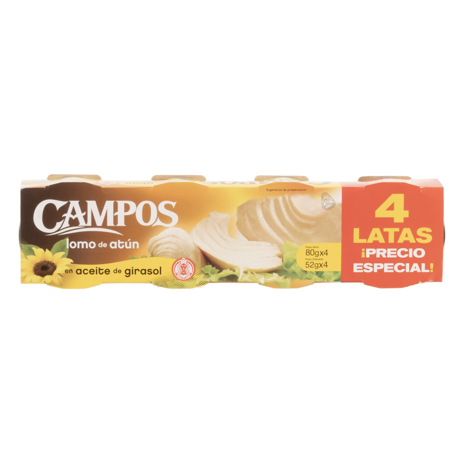 consultando preciosAtún Lomitos En Aceite De Girasol CAMPOS 4 X 80 G – CAMPOS. Disponible en nuestros locales. Precio y stock pueden variar según la tienda.