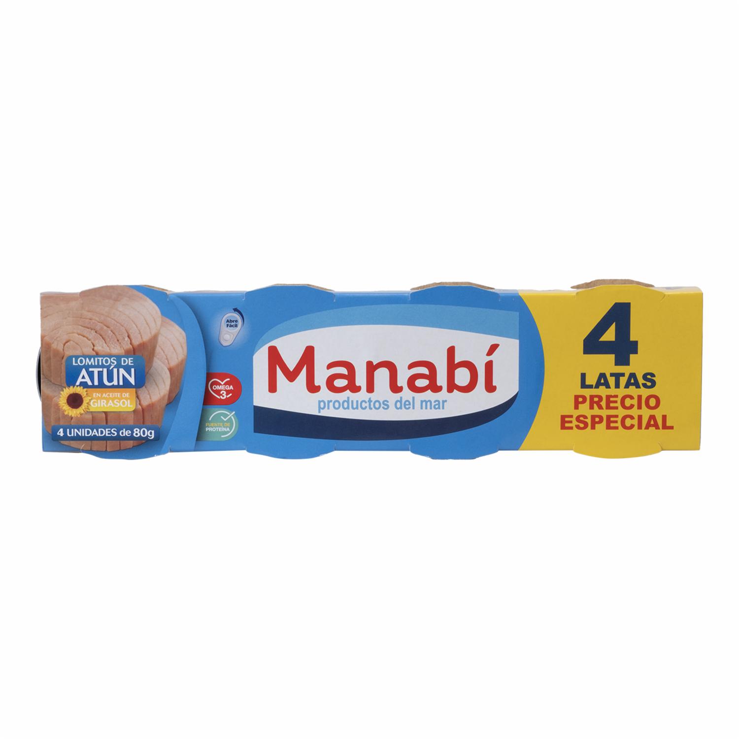 - Disfruta del sabor auténtico del mar con estos lomitos de atún MANABÍ. Conservados en aceite de girasol para mantener su frescura y jugosidad, son ideales para preparar ensaladas, pastas o bocadillos saludables. Su presentación en pack de 4 te da practicidad y buen rendimiento
