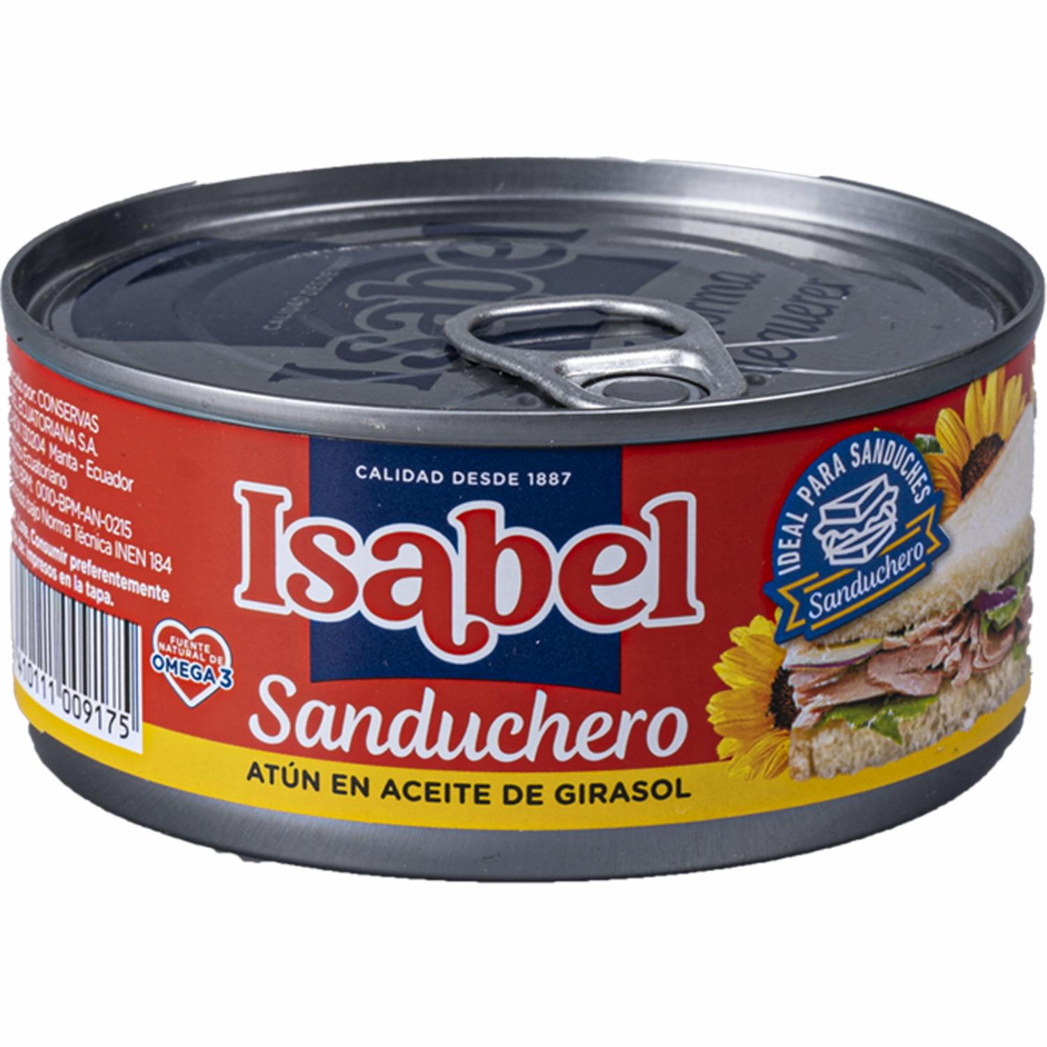 - Disfruta de la conveniencia y el delicioso sabor del Atún Sanduchero ISABEL en su presentación de 160 g. Este atún, especialmente diseñado para sándwiches, brinda una opción rápida y sabrosa para tus comidas diarias