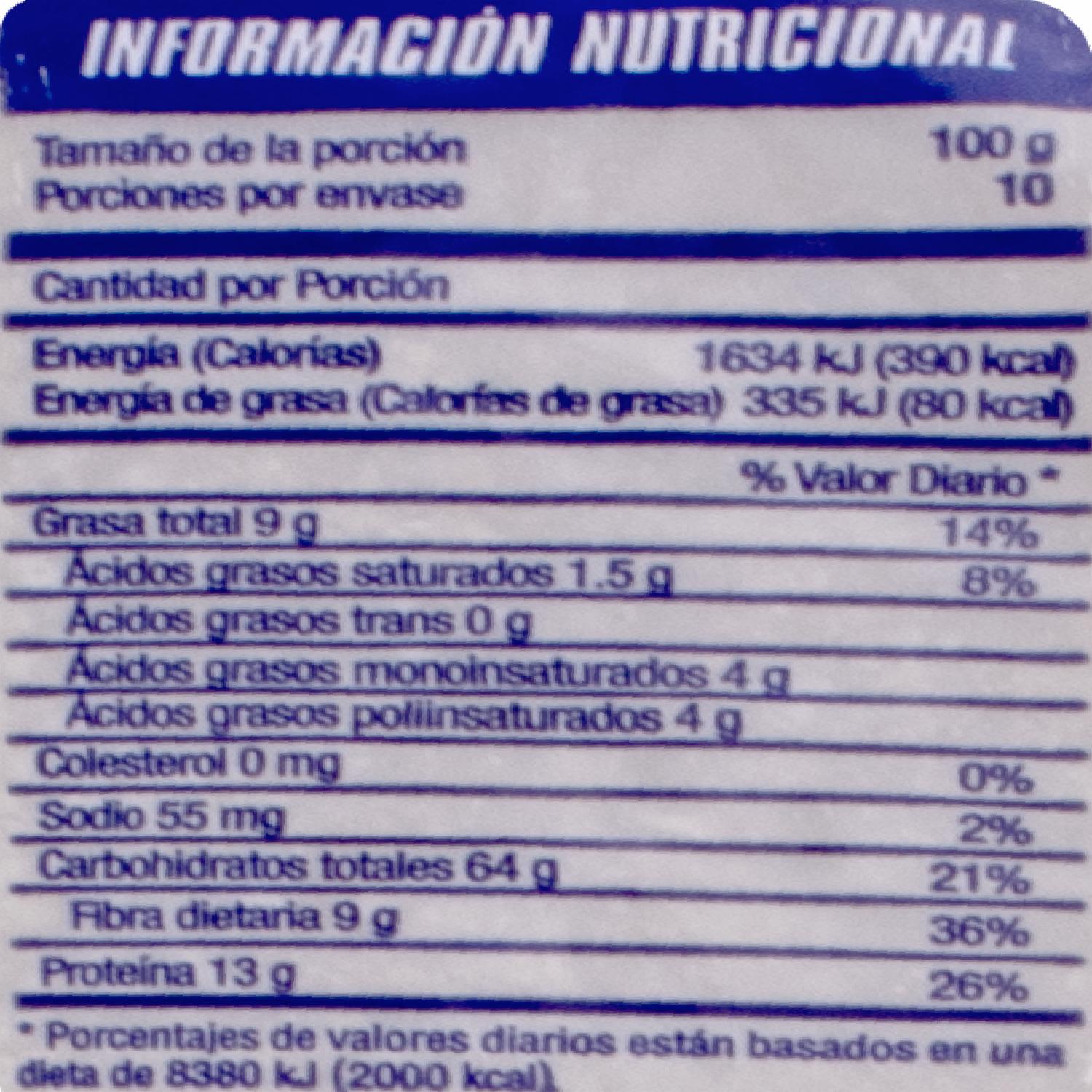 Alto en fibra y 100% natural. Aporta fibra natural y fortalece el sistema digestivo. Fortificada con vitaminas y minerales. Enriquecida con hierro y ácido fólico. Baja en grasa y sodio. Ideal para preparar pastas, sopas, coladas y batidos