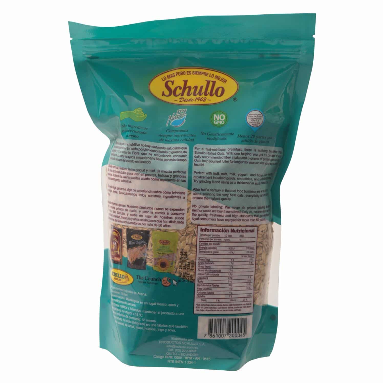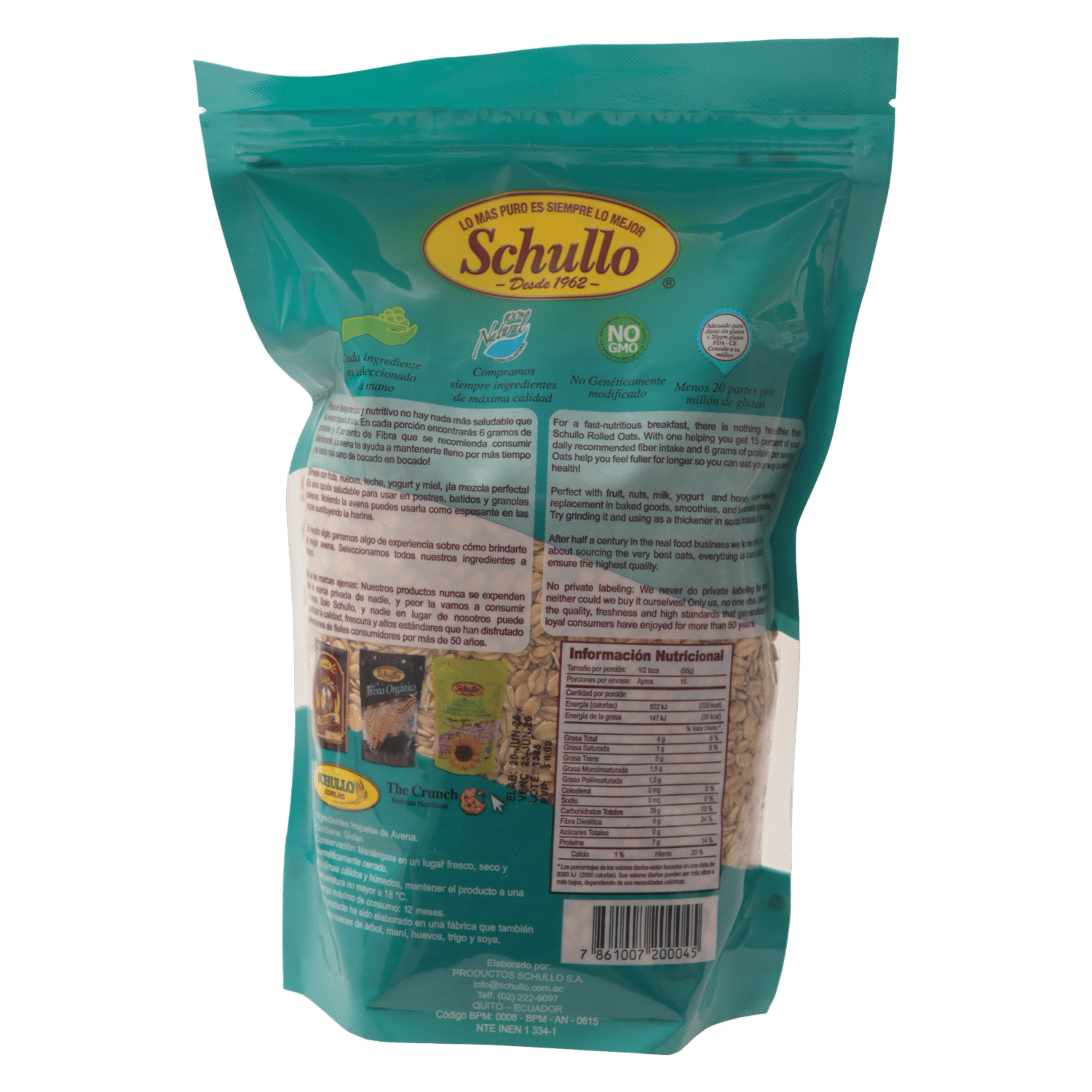 • Para un desayuno rápido y nutritivo no hay nada más saludable que la avena de Schullo. En cada porción encontrarás 7g de proteína y 24 % de fibra, cantidad óptima recomendada para consumir diariamente