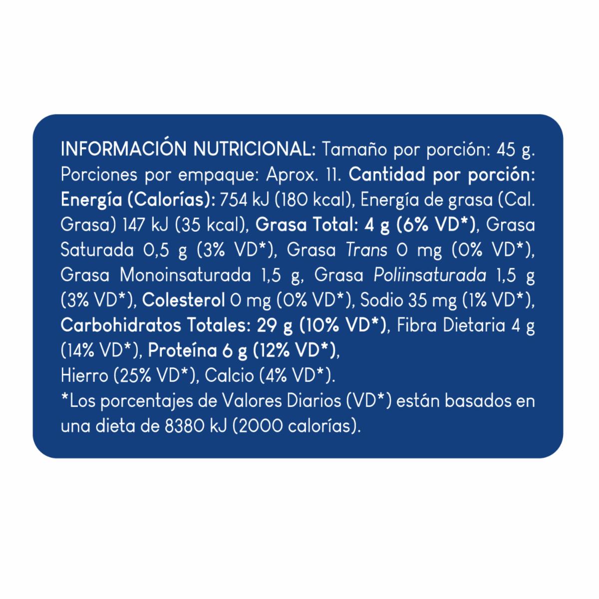 - Elaborada con avena en hojuelas, alto en fibra