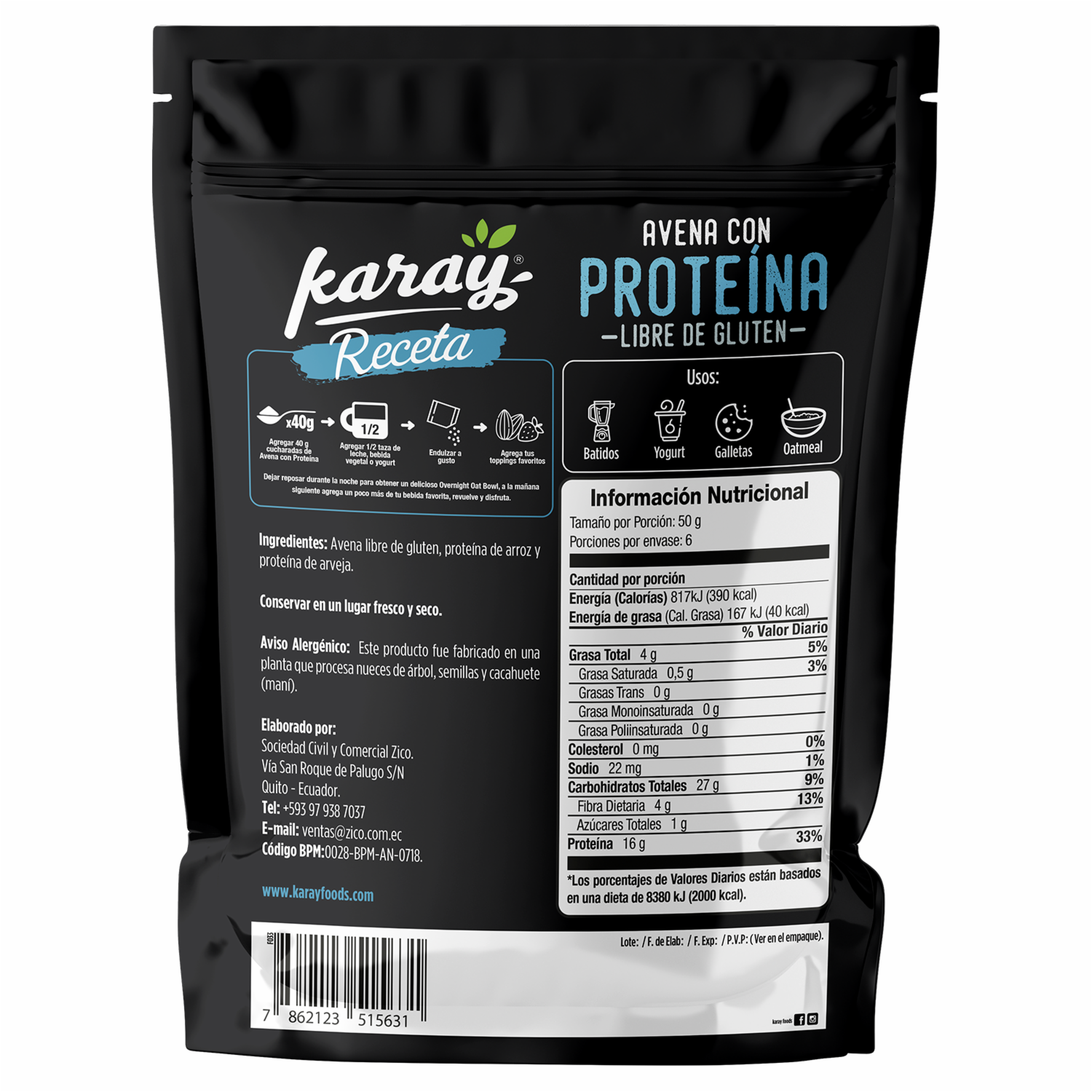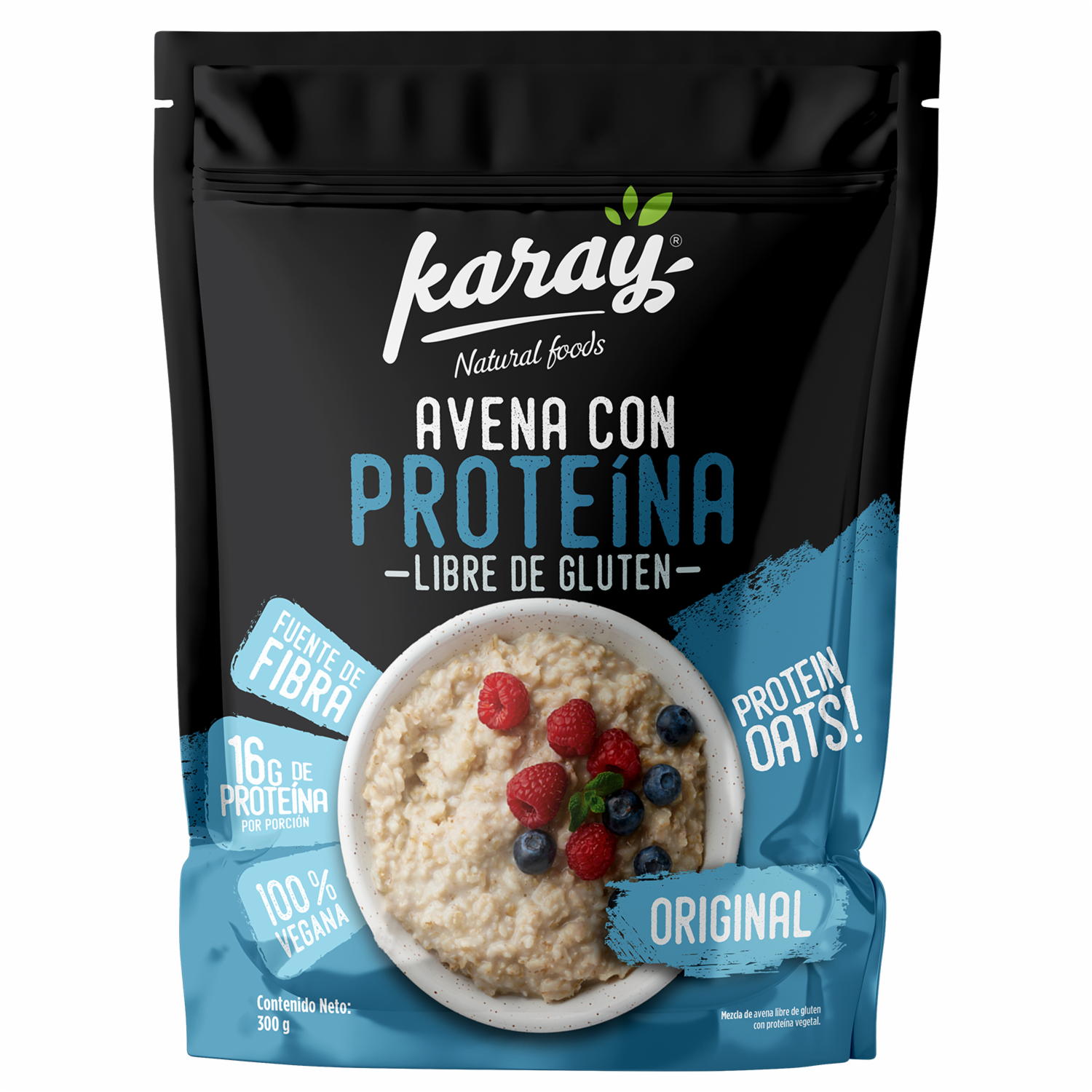 - Avena proteica sin azúcar de KARAY: 16 g de proteína vegetal por porción. Ideal para desayunos y snacks saludables, rica en proteínas y sin azúcares añadidos. Aliada para aumentar masa muscular con proteínas, carbohidratos de digestión lenta y grasas saludables