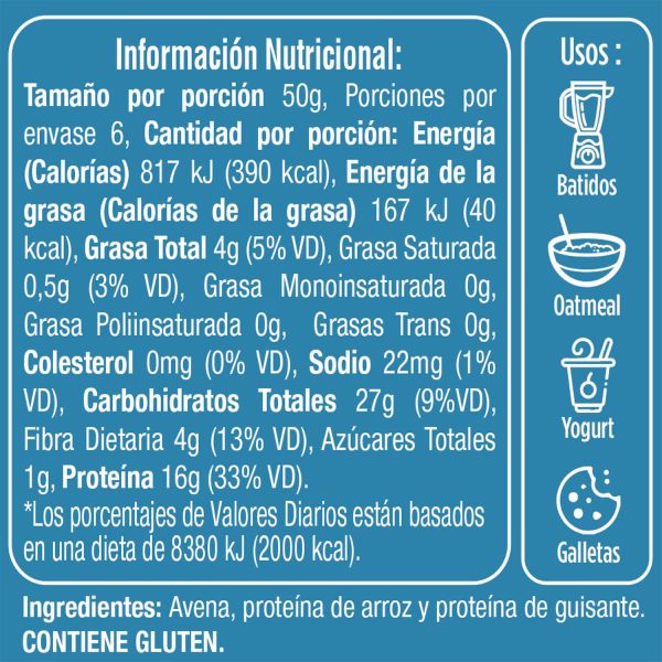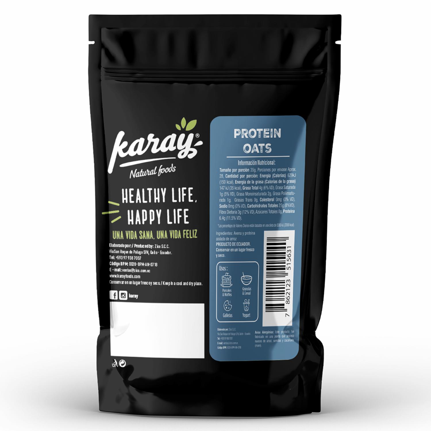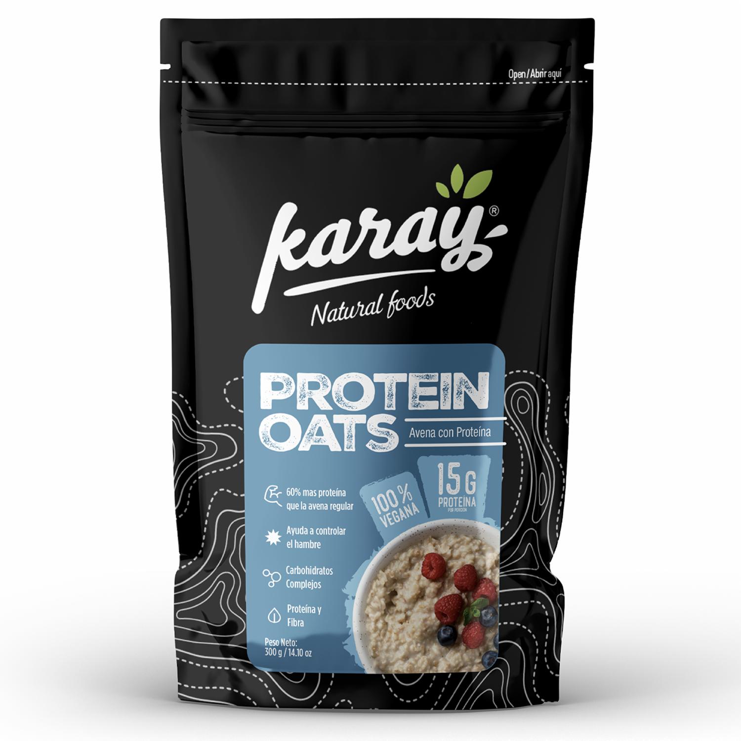 Avena proteica sin azúcar de KARAY: 16 g de proteína vegetal por porción. Ideal para desayunos y snacks saludables, rica en proteínas y sin azúcares añadidos. Aliada para aumentar masa muscular con proteínas, carbohidratos de digestión lenta y grasas saludables