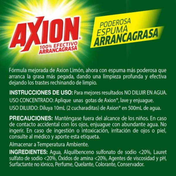 • Deja impecable tu vajilla con el Lavaloza Líquido Axion Limón, su presentación de 750 ml es ideal para ti y tu familia. Este Lavaloza te ayudará a eliminar los restos de alimentos, grasa o cualquier tipo de suciedad que se almacenan en platos, ollas y sartenes