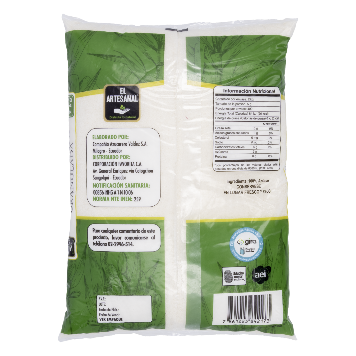 - Azúcar blanca refinada EL ARTESANAL en presentación de 2000 g, ideal para endulzar bebidas, preparar postres y recetas de repostería. De textura fina y fácil disolución, perfecta para uso doméstico o comercial
