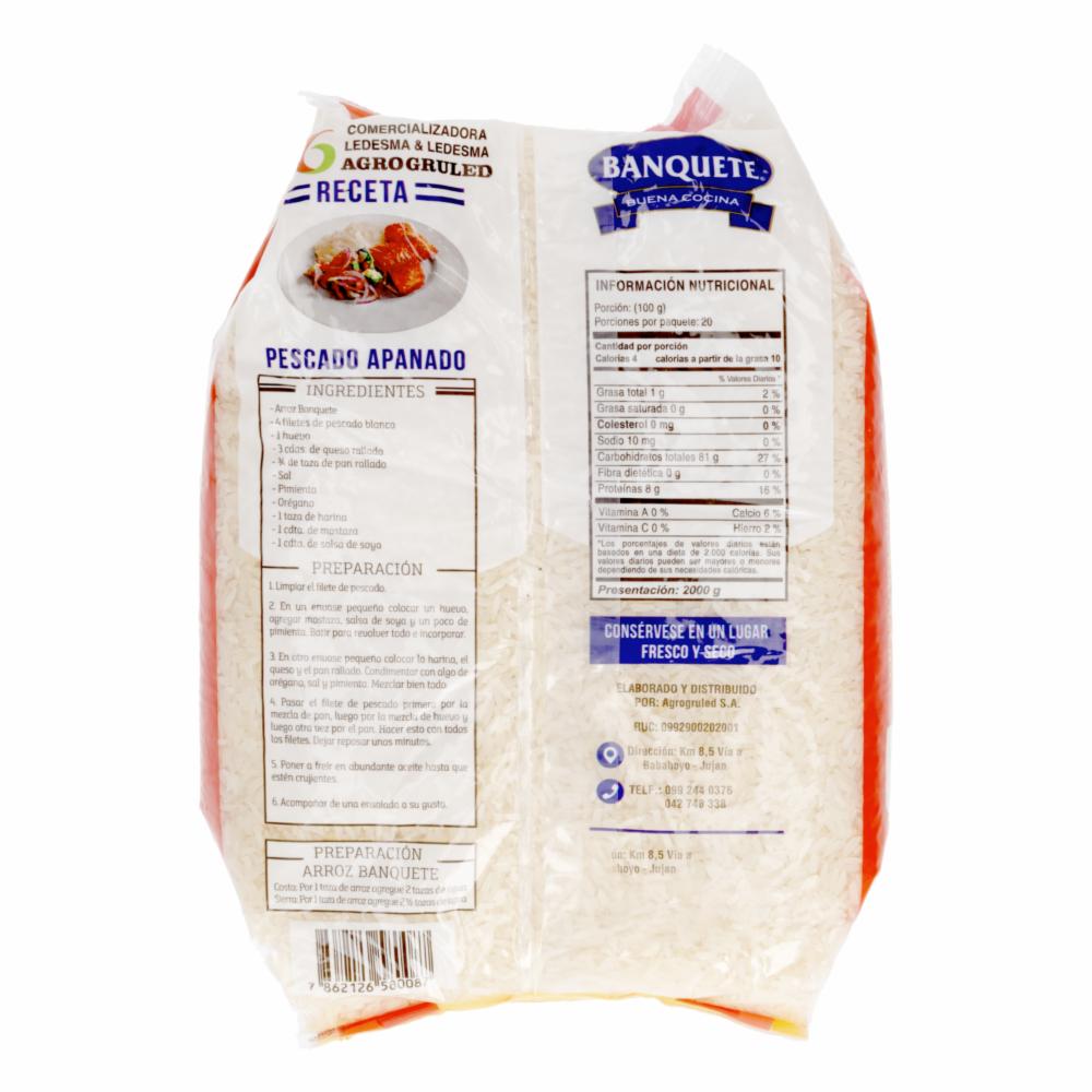 Aporta vitaminas como provitamina A, vitamina B1, B3 y B12.El Arroz Seleccionado Premium Grado 1 BANQUETE 2000 G es la elección perfecta para quienes buscan calidad y sabor inigualables en cada platillo. Con granos meticulosamente seleccionados y procesados, este arroz lleva tus comidas a un nivel superior