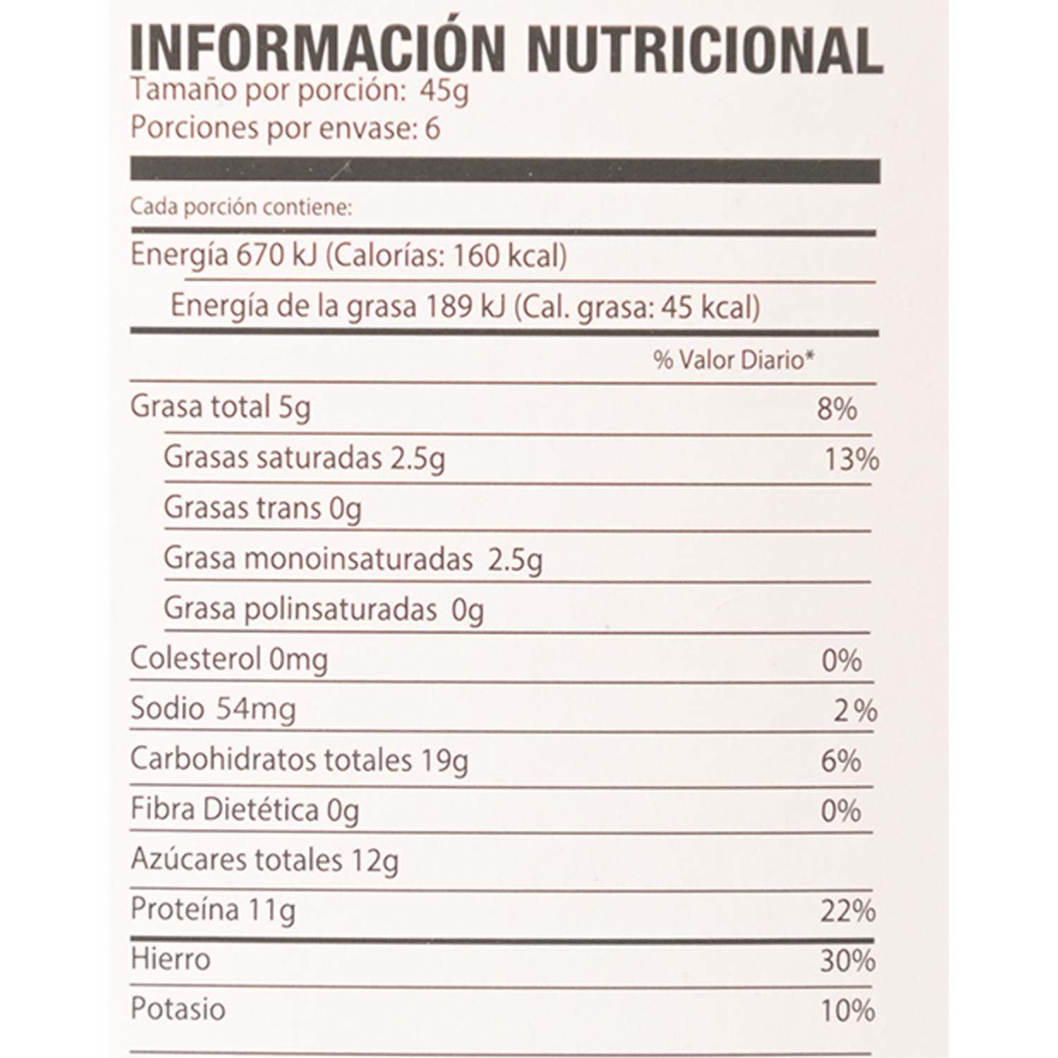 - Barra de cereal con sabor a chocolate, maní y almendra. - Contiene proteínas y fibra. - Es una fuente de energía para el cuerpo. - Ideal para consumir como snack entre comidas o durante actividades físicas. - No contiene gluten ni lactosa, por lo que es apta para personas con intolerancias alimentarias