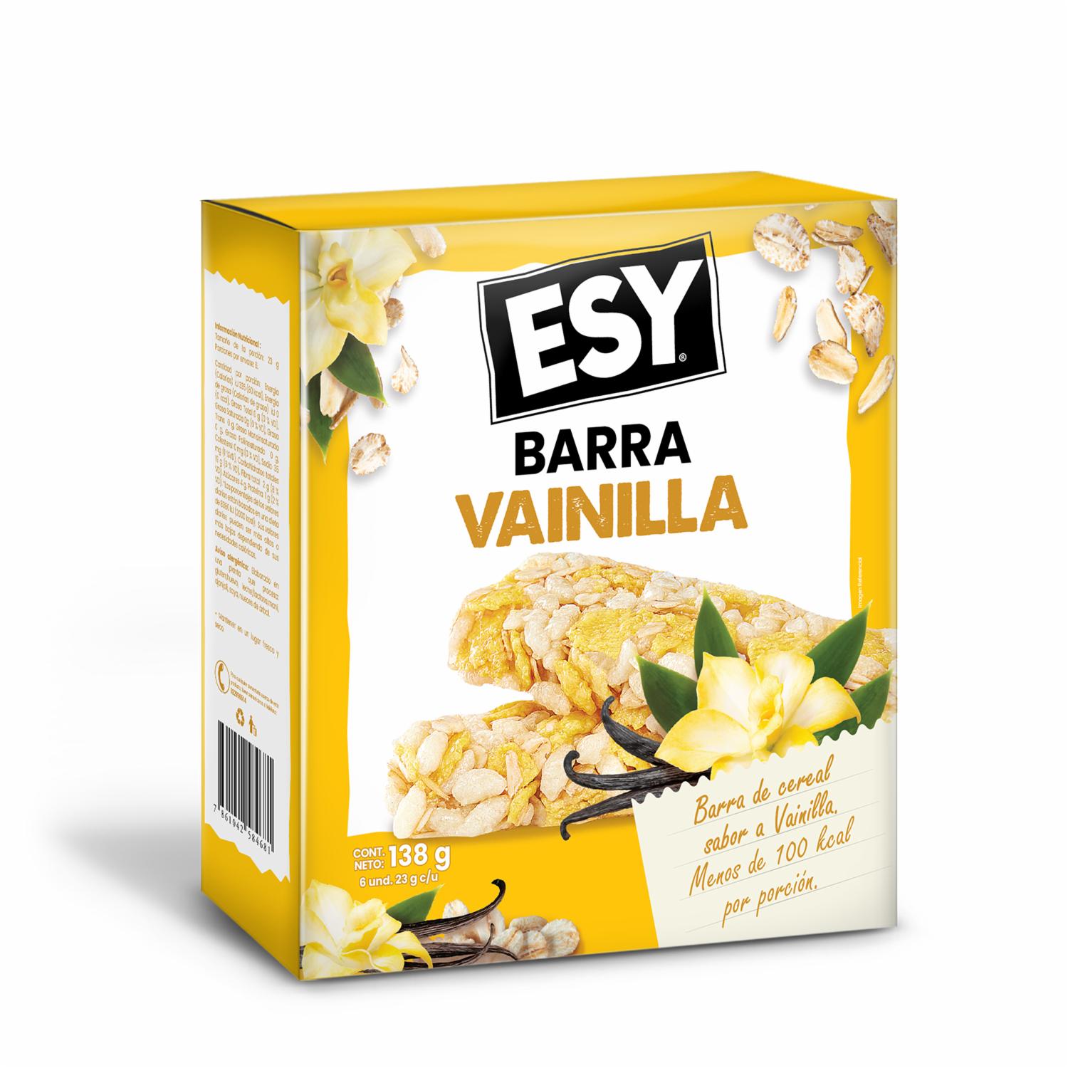 - La "Barra de Cereal Sabor a Vainilla ESY 138 g" es un producto alimenticio que pertenece al grupo de las barras de cereales, que son bocadillos portátiles y convenientes diseñados para proporcionar energía rápida y satisfacer el hambre entre comidas
