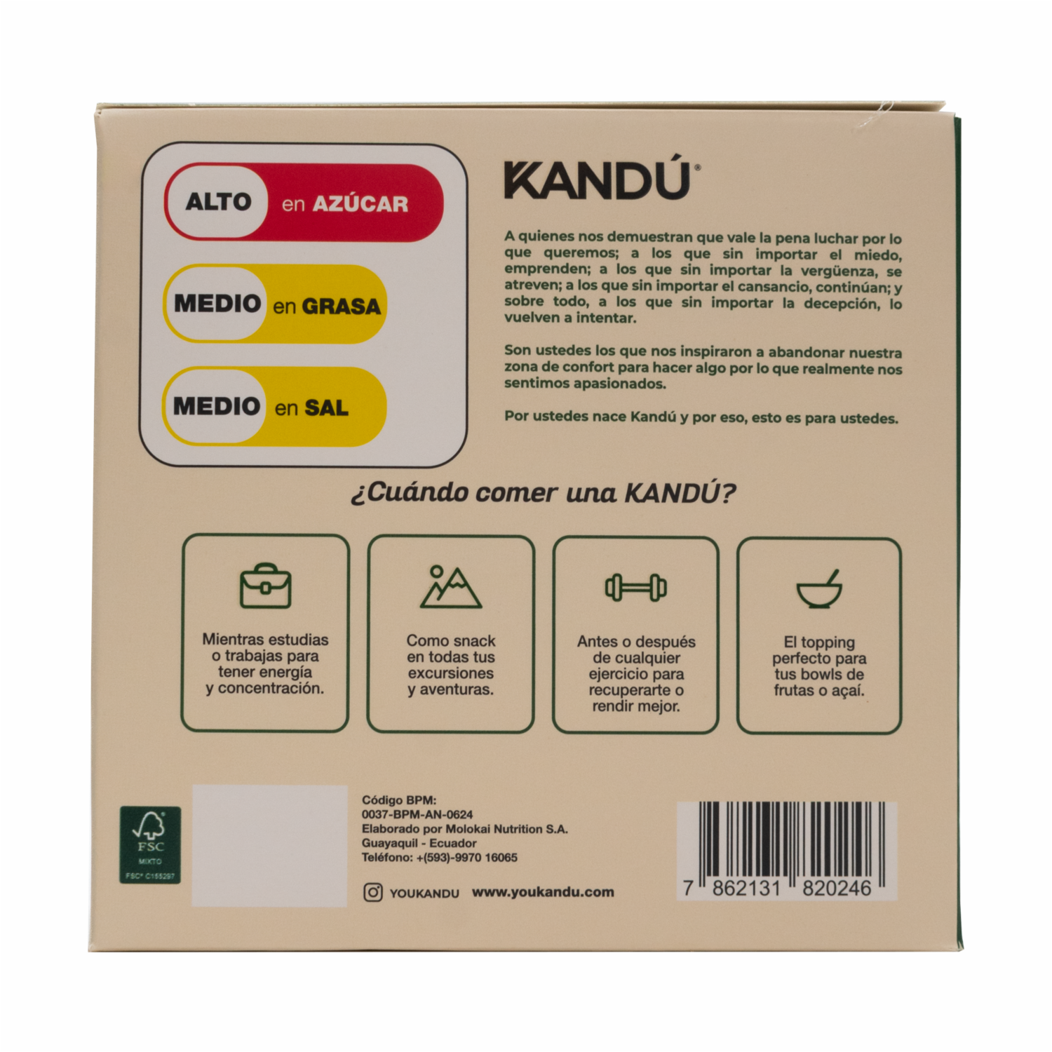- Snack para cualquier hora del día, ideal para usarlo entre comidas o en esos días en los que no alcanza el tiempo para desayunar o almorzar llénate de energía natural con la combinación perfecta de café, banano y chocolate. Esta barra te aporta sabor en cada bocado, ideal para esos momentos en que necesitas un impulso durante el día. Práctica y deliciosa, es la compañera perfecta para el trabajo, el deporte o tus paseos