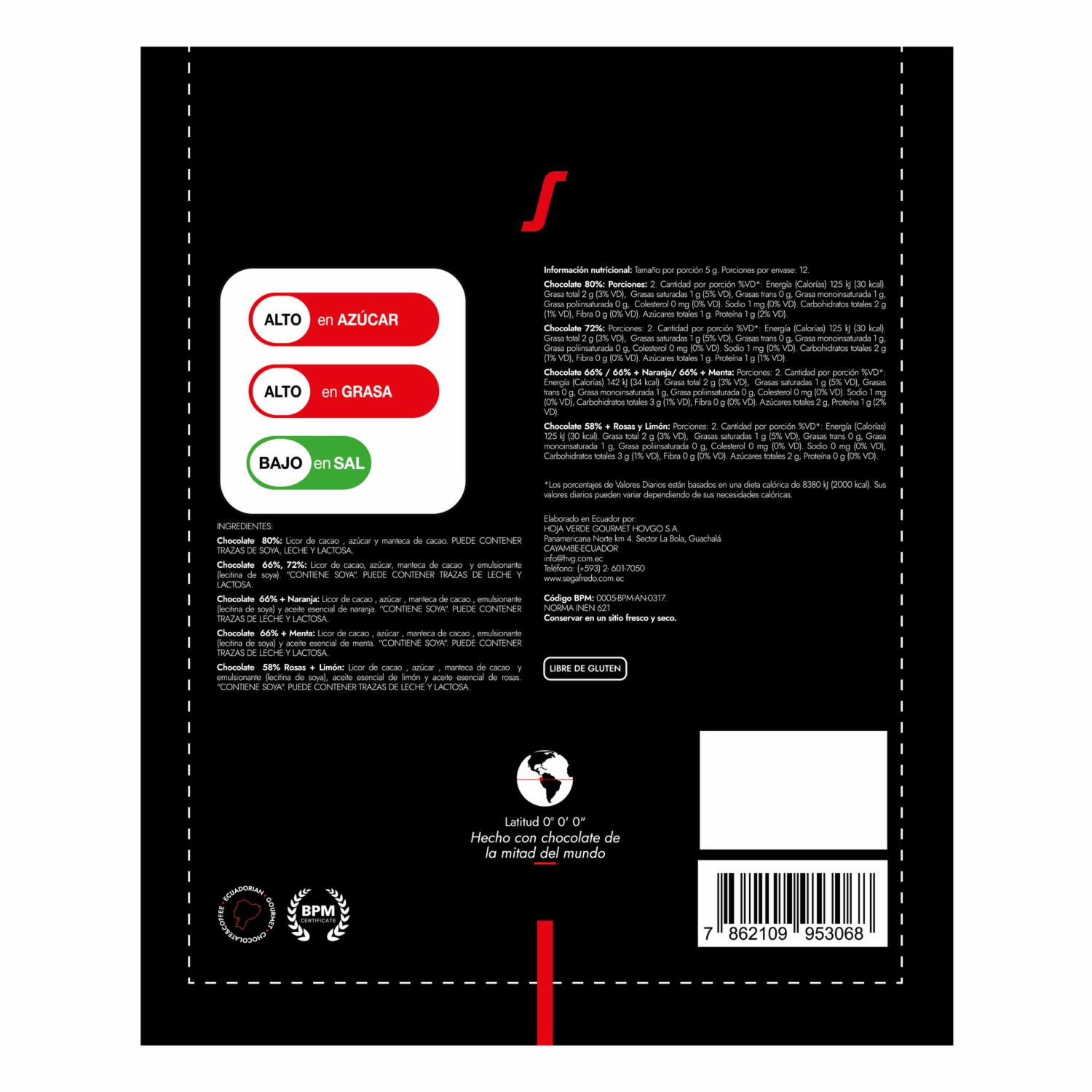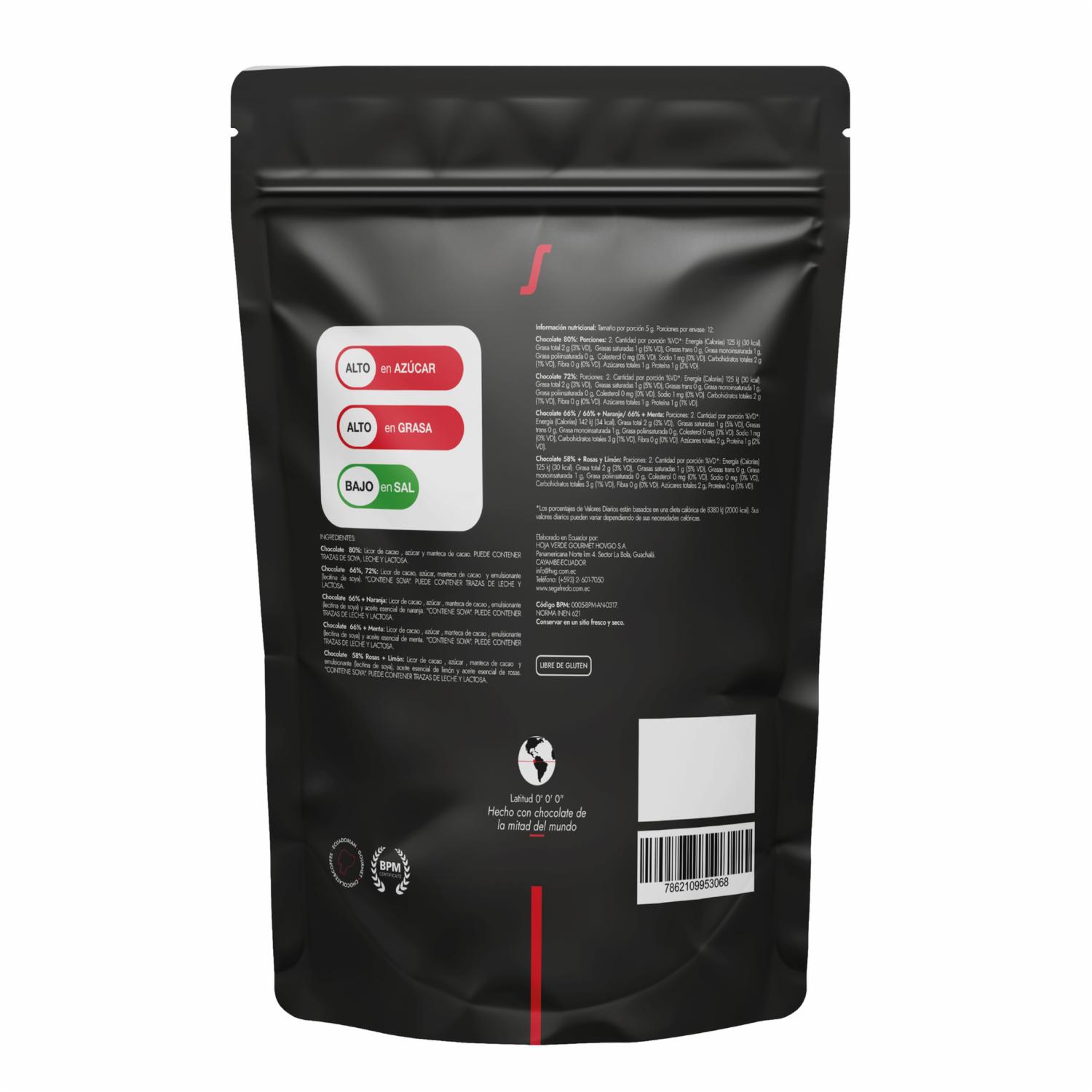 Mini barra de 5 gramos elaborada con cacao fino de aroma. Chocolate: 80%, 72%, 66%, 66% + Menta, 66% + Naranja, 58% + Rosas + Limón