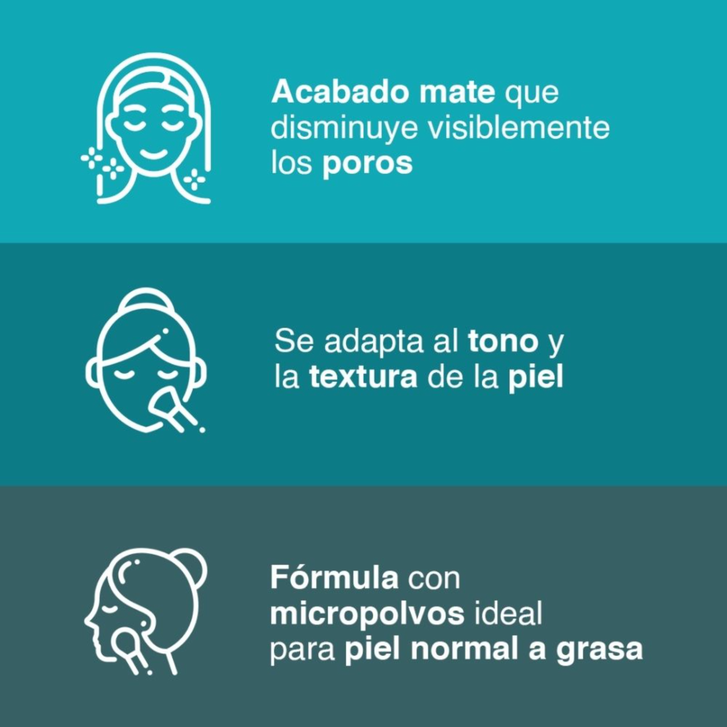 -Nuestra exclusiva fórmula con micropolvos controla la grasa y difumina los poros dejando un acabado natural, matificado e impecable.