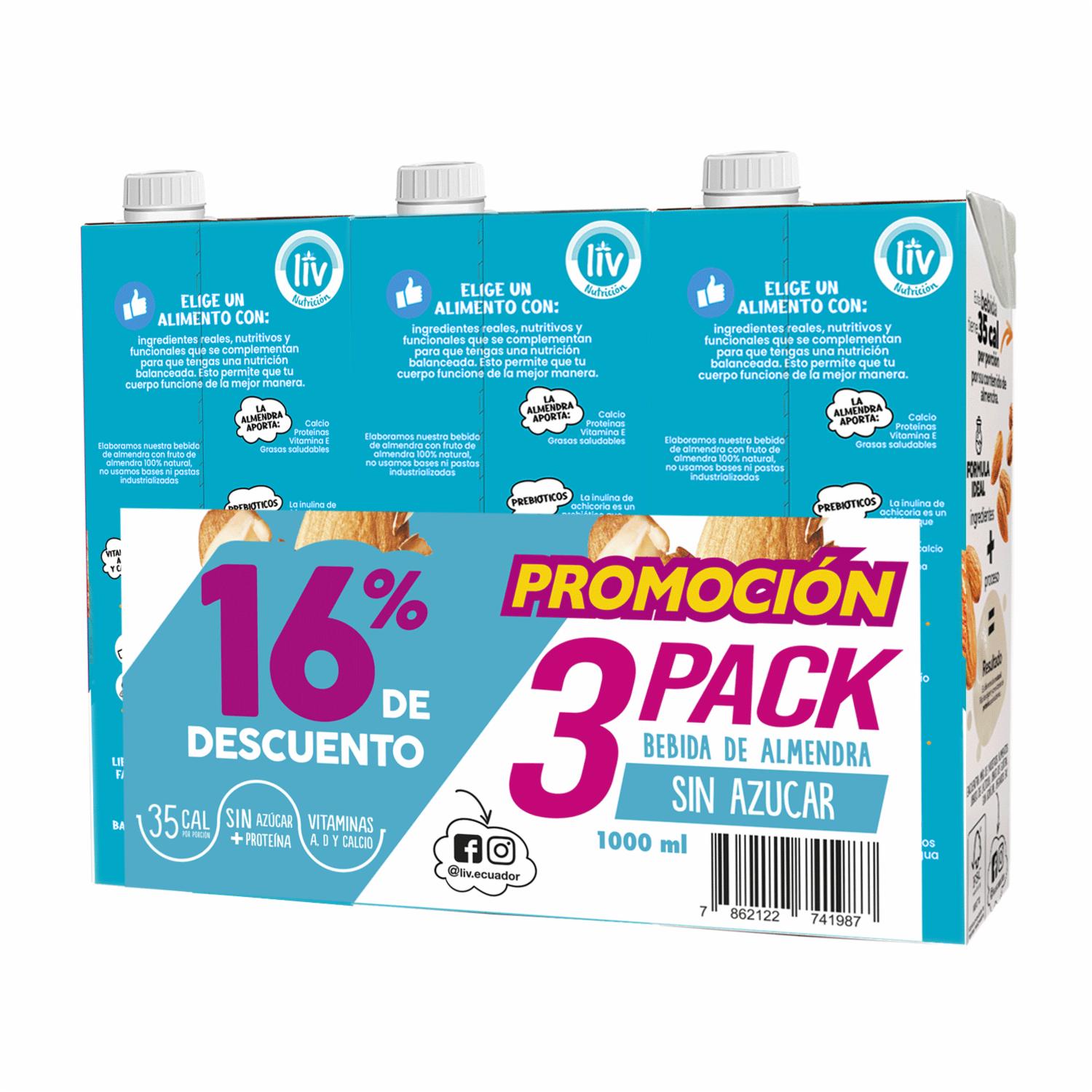 - La Bebida De Almendra Sin Azúcar "3pack Liv" Viene En Una Presentación De 3 Envases De 1,000 Ml Cada Uno. Las Bebidas De Almendra Sin Azúcar Son Una Alternativa Popular A La Leche De Vaca Tradicional Para Aquellos Que Buscan Reducir Su Consumo De Lácteos O Buscan Opciones Más Saludables,estas Bebidas Se Elaboran A Partir De Almendras Trituradas Y Filtradas, Y Generalmente Se Endulzan De Forma Natural O Se Ofrecen En Versiones Sin Azúcar Agregada
