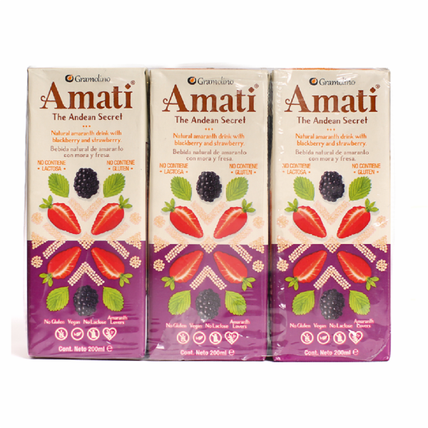 • Six Pack Amati Bebida De Amaranto Mora Fresa Bebida Vegetal De Amaranto Con Mora Y Fresa 100X100 Natural, Libre De Conservantes Y Preservantes, Gluten Free, Lactose Free, Comercio Justo AMATI THE ANDEAN SECRET 6 X 200 MlBebida vegetal de amaranto con mora y fresa 100X100 natural, libre de conservantes y preservantes, GLUTEN FREE, LACTOSE FREE