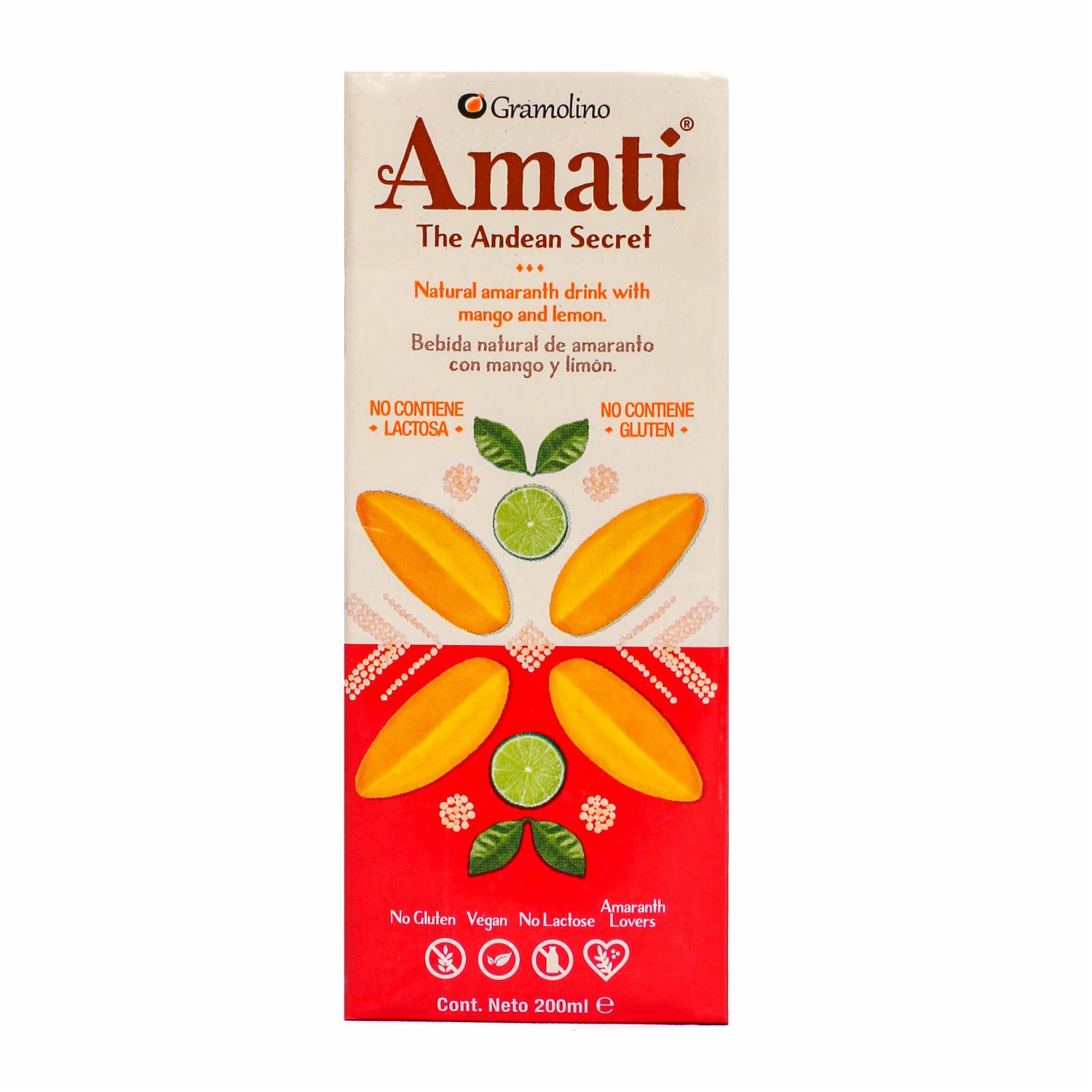• Amati Bebida Mango Limon 200 Ml Bebida Vegetal De Amaranto Con Mango Y Limón 100X100 Natural, Libre De Conservantes Y Preservantes, Gluten Free, Lactose Free, Comercio Justo AMATI THE ANDEAN SECRET 200 MlBebida vegetal de amaranto con mango y limón 100X100 natural, libre de conservantes y preservantes, GLUTEN FREE, LACTOSE FREE