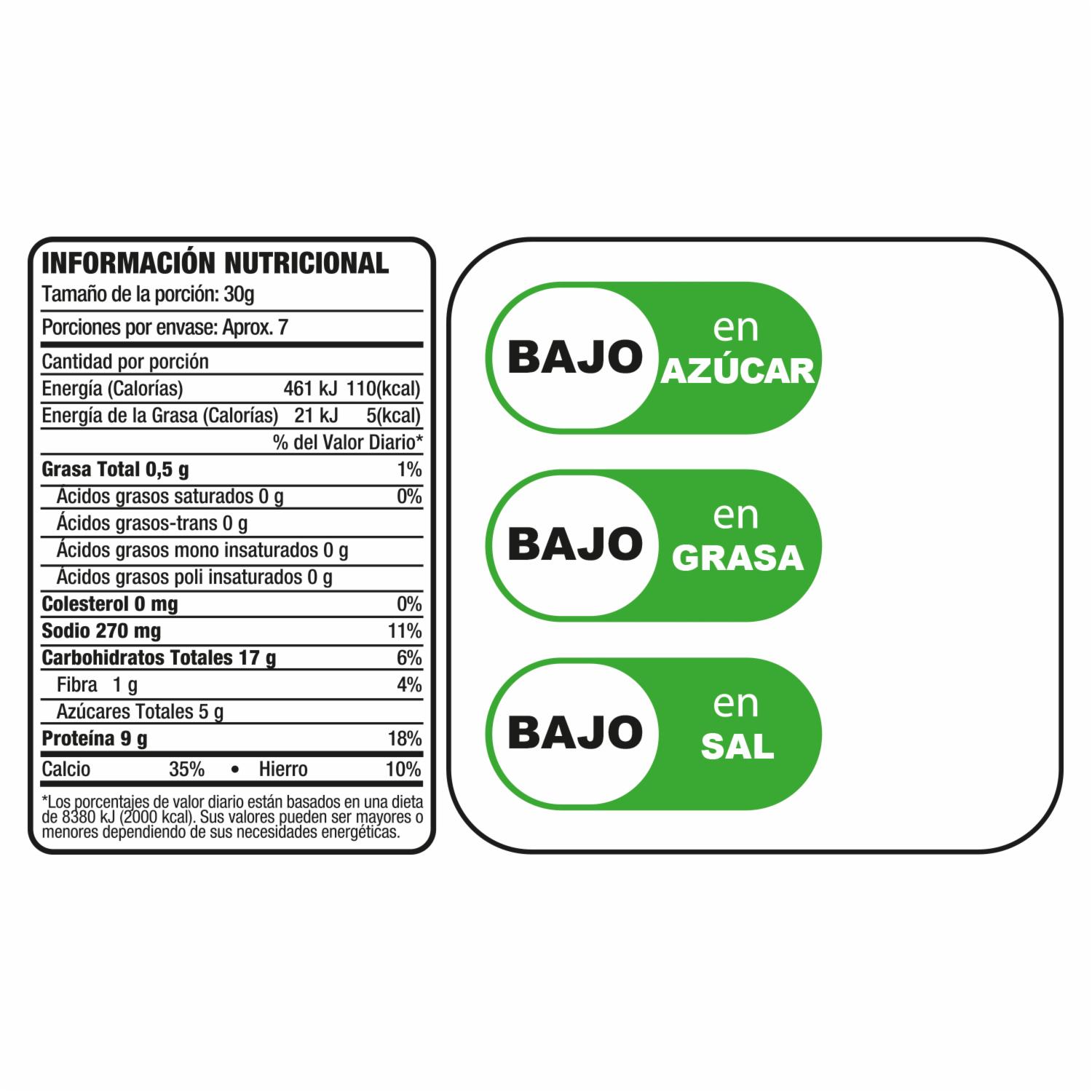 Contiene 18% Proteina, 35% Calcio, 0% Lactosa, 0% Colesterol