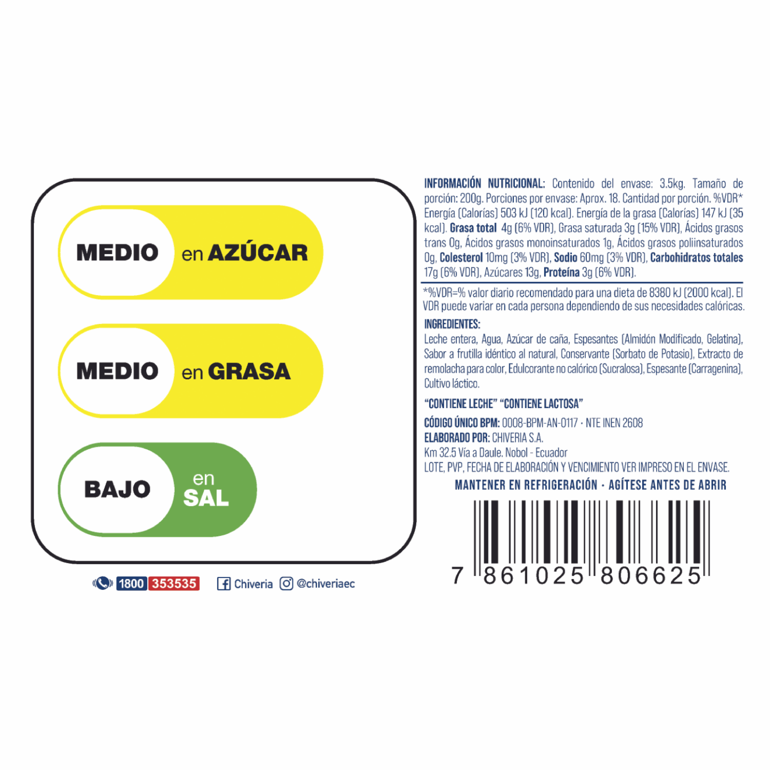 Deliciosa y saludable bebida de yogur CHIVERIA elaborada con 60% yogur, libre de colorantes artificiales. Este producto contiene edulcorante no calórico