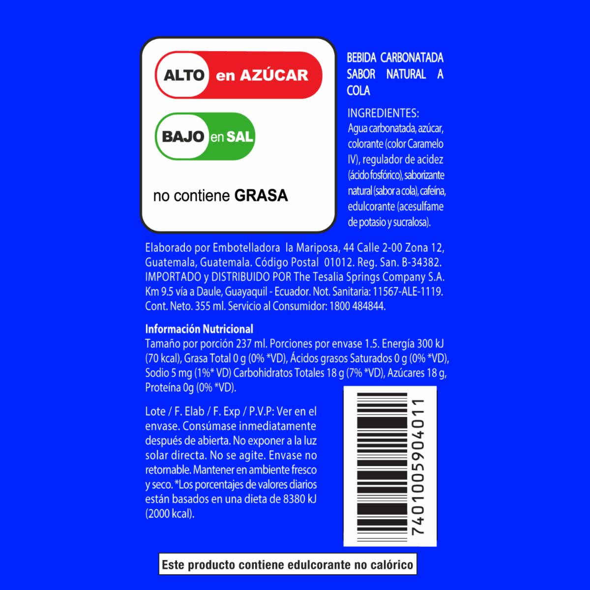 Bebida gaseosa carbonatada refrescante, sabor natural a Cola. Pepsi con sabor clásico