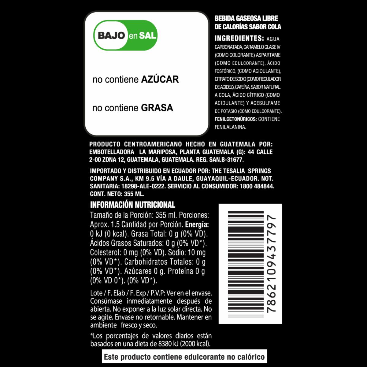 Bebida gaseosa carbonatada refrescante, sin azúcar, sabor natural a cola