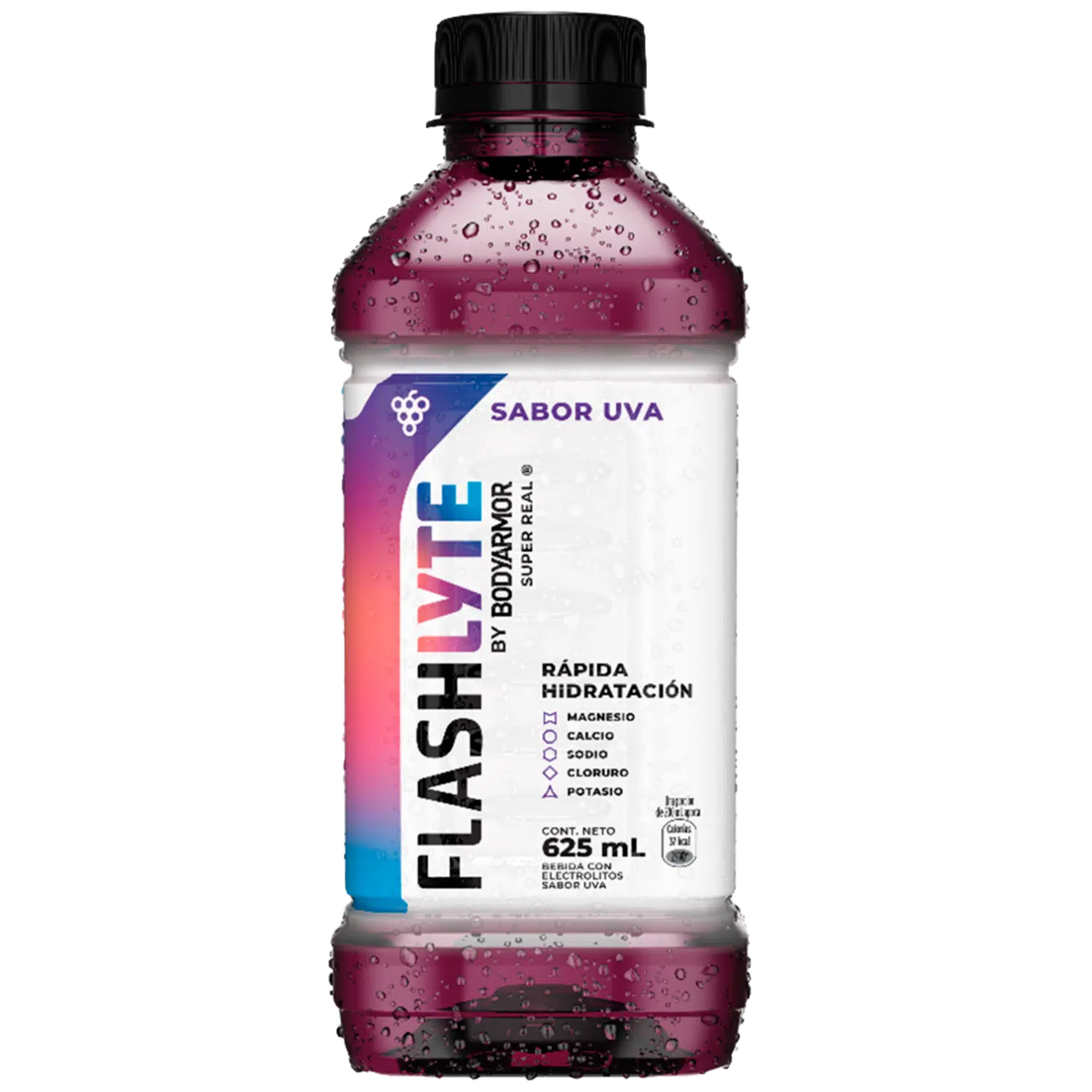 Flashlyte es una bebida con electrolitos diseñada para proporcionar hidratación rápida y ayudar a mantener la energía. Ofrece varios sabores, como uva y fresa, y está disponible en presentaciones de 625 ml. Esta bebida es ideal para quienes buscan una opción refrescante y efectiva para evitar la deshidratación