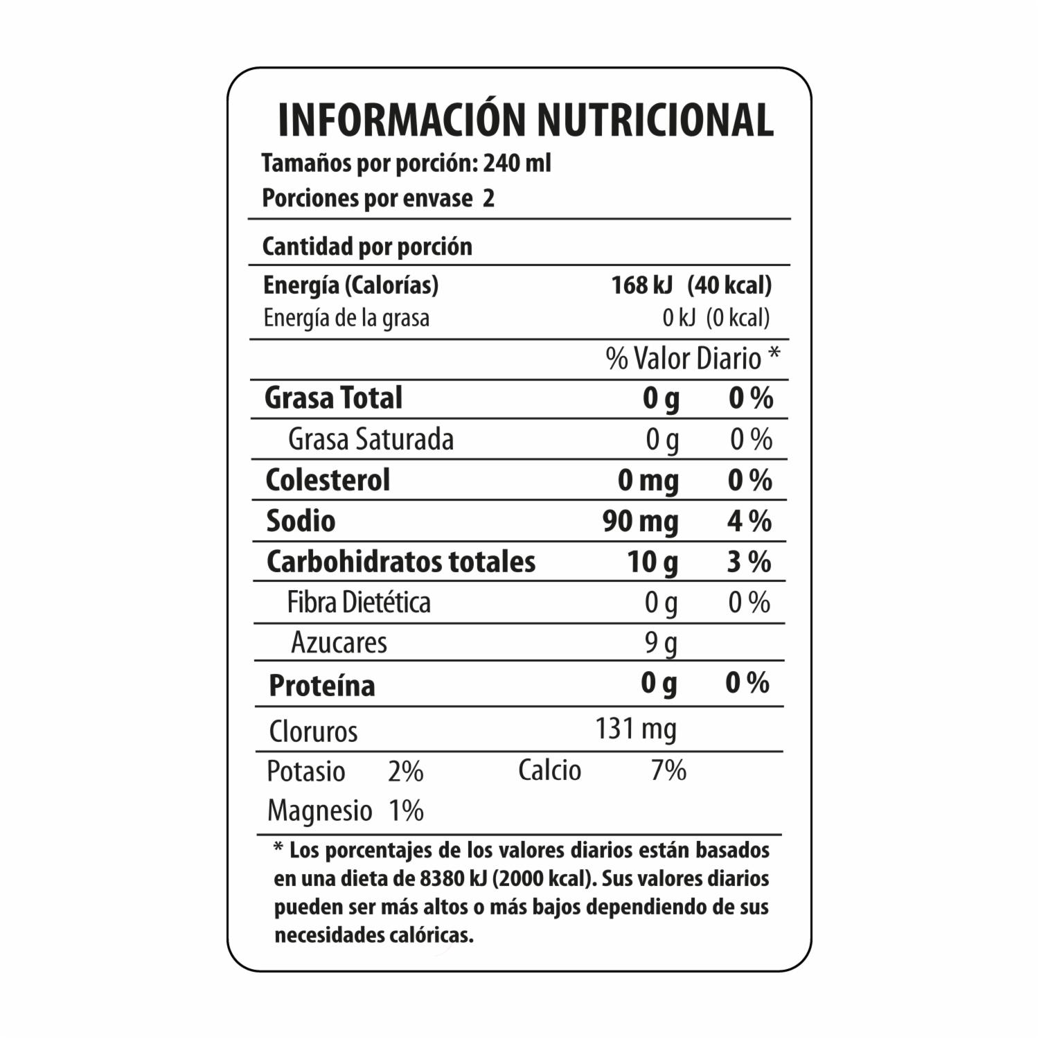 Bebida hidratante con sabor a Tropical Fruits. Contiene potasio, calcio, sodio y magnesio