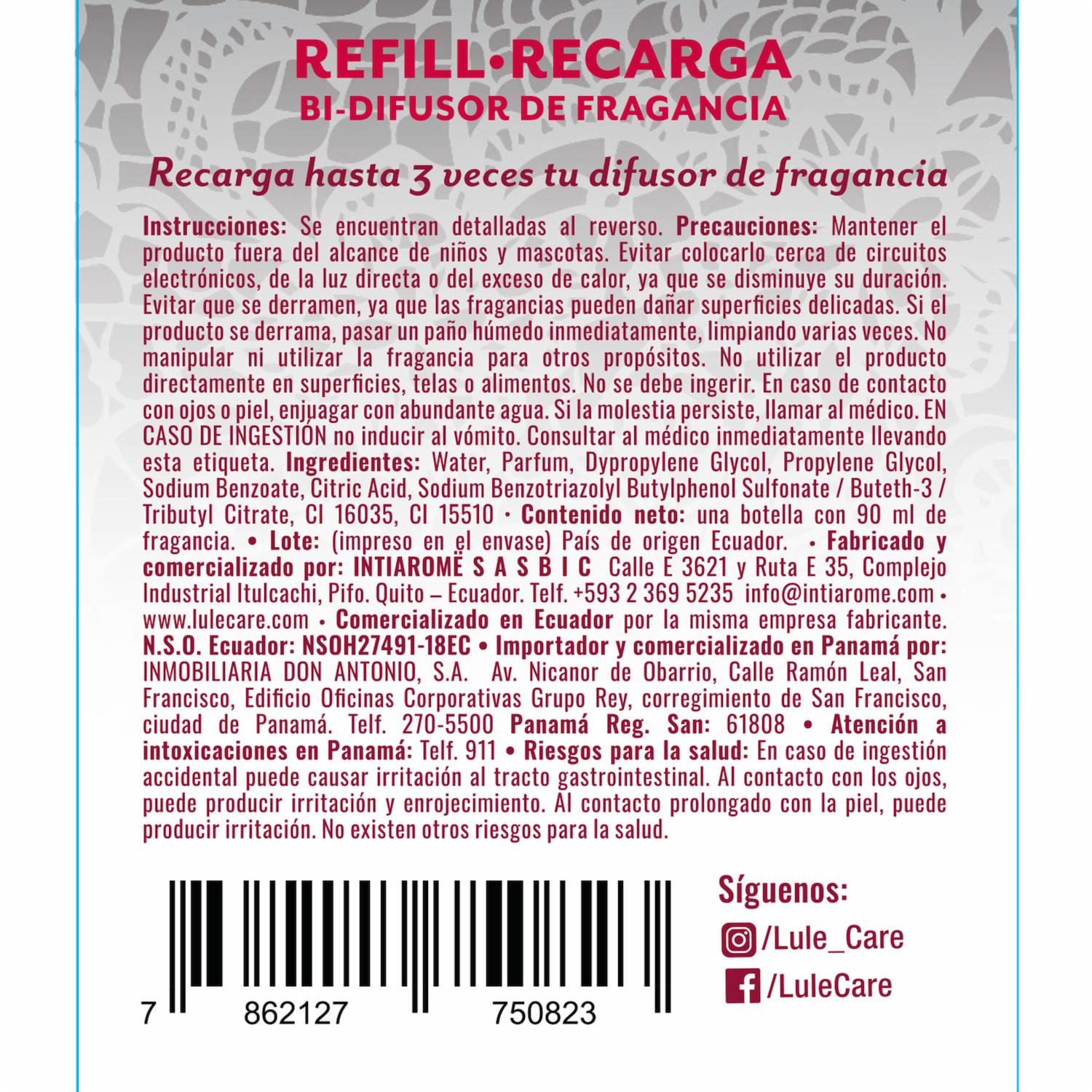 • Recarga X 3 para Bi-Difusor de Fragancia LULE, frasco de vidrio con 90ml