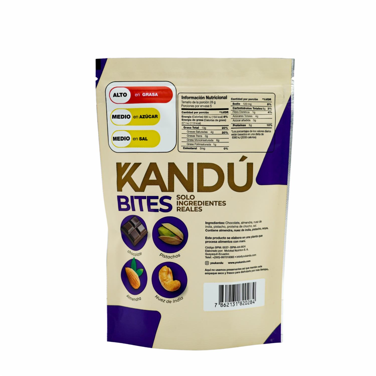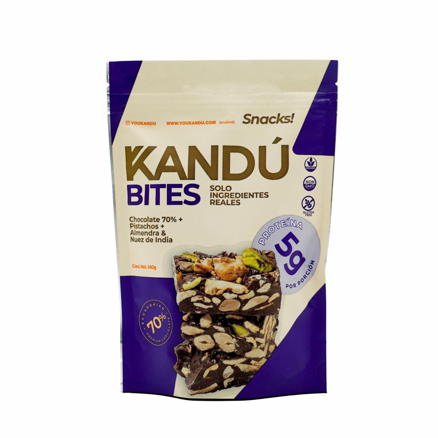 - Los Kandú Bites son ricos en frutos secos, llevan proteína vegetal proveniente del Chocho, y están cubiertos por un delicioso chocolate ecuatoriano de 70%.Un producto hecho de ingredientes reales, 100% natural, y que te aporta mucha energía