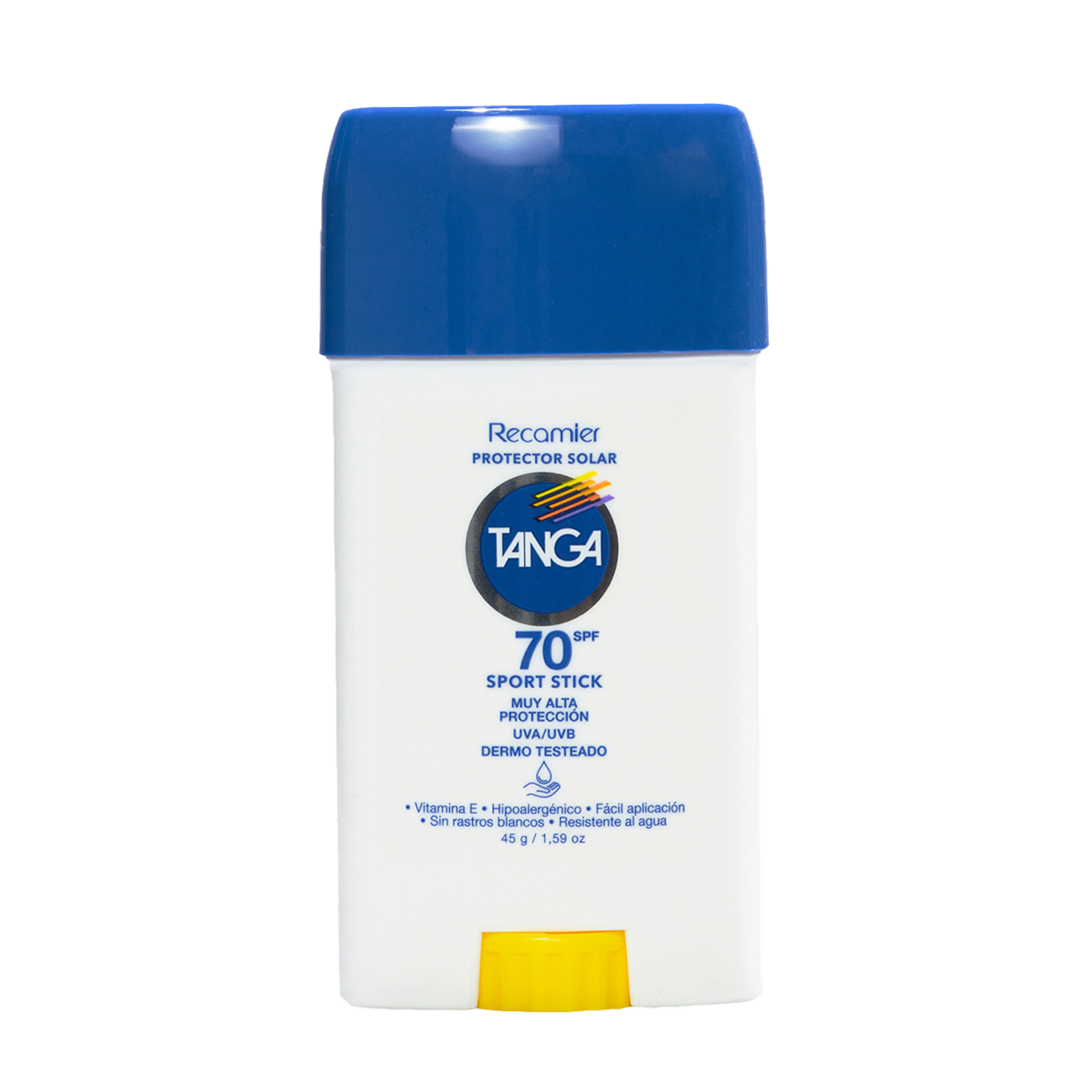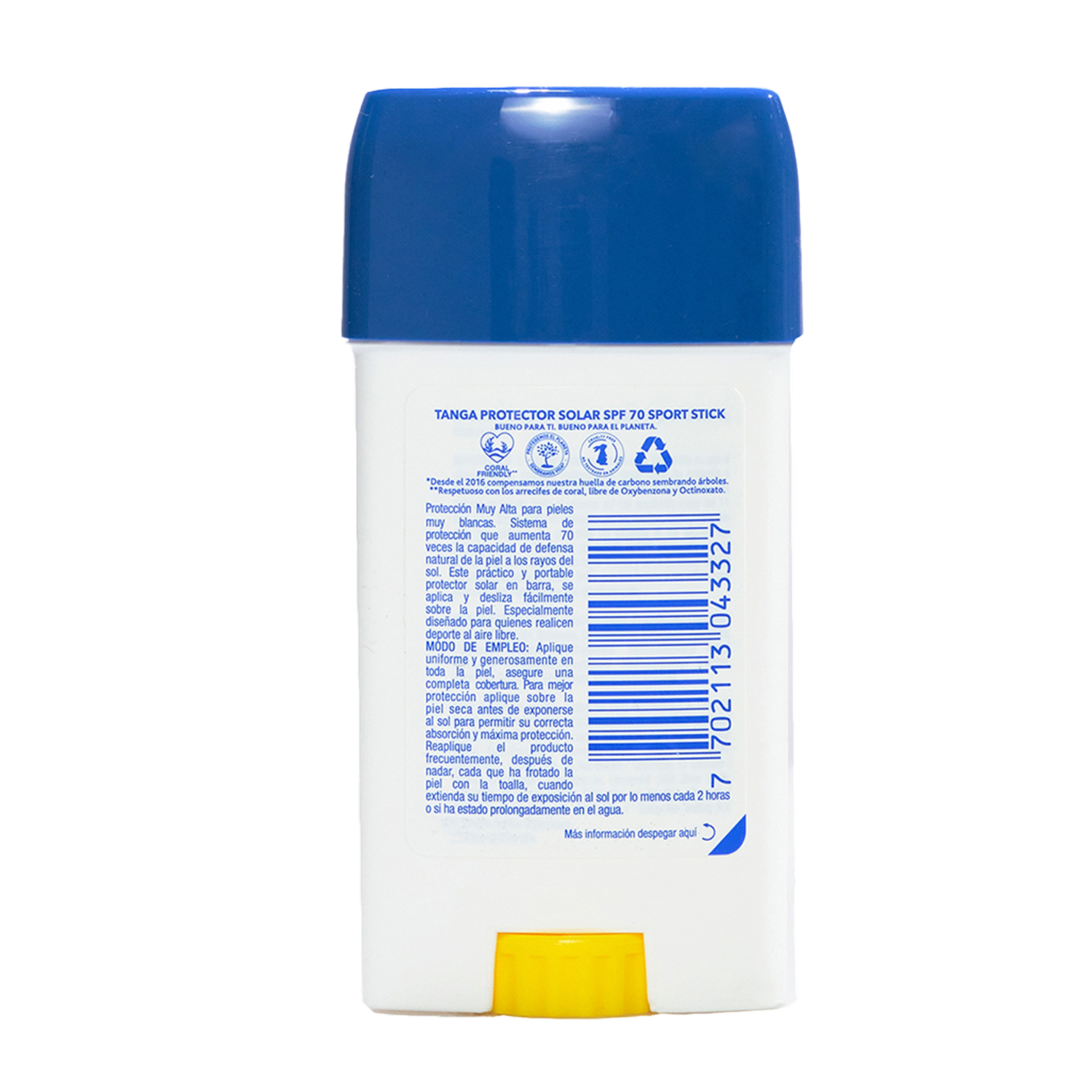 - El bloqueador solar Sport Stick SPF 70 de Tanga viene en un formato de stick conveniente y fácil de aplicar, lo que lo hace perfecto para llevar contigo a todas tus aventuras. Su fórmula avanzada proporciona una protección de amplio espectro, ayudando a prevenir quemaduras solares y protegiendo contra el envejecimiento prematuro de la piel causado por el sol