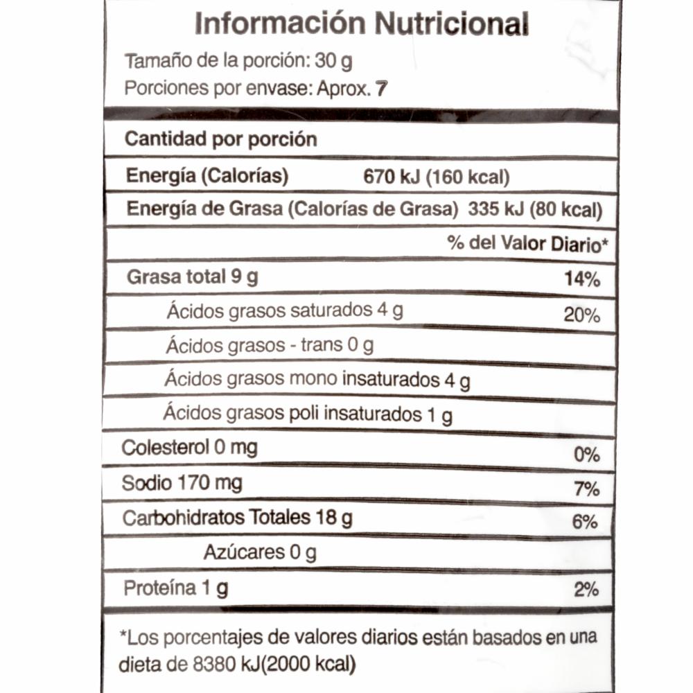 Contiene: papas fritas, plátanos, expandido de trigo sabor artificial a tocino, sabor picante