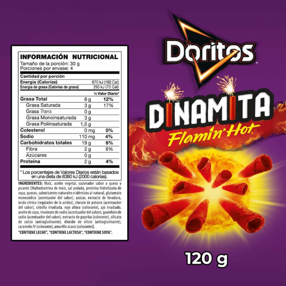 • Los bocaditos de maíz sabor a Dinamita Flamin' Hot de Doritos son una variante de tortillas de maíz que se caracterizan por su audaz y picante sabor "Flamin' Hot"