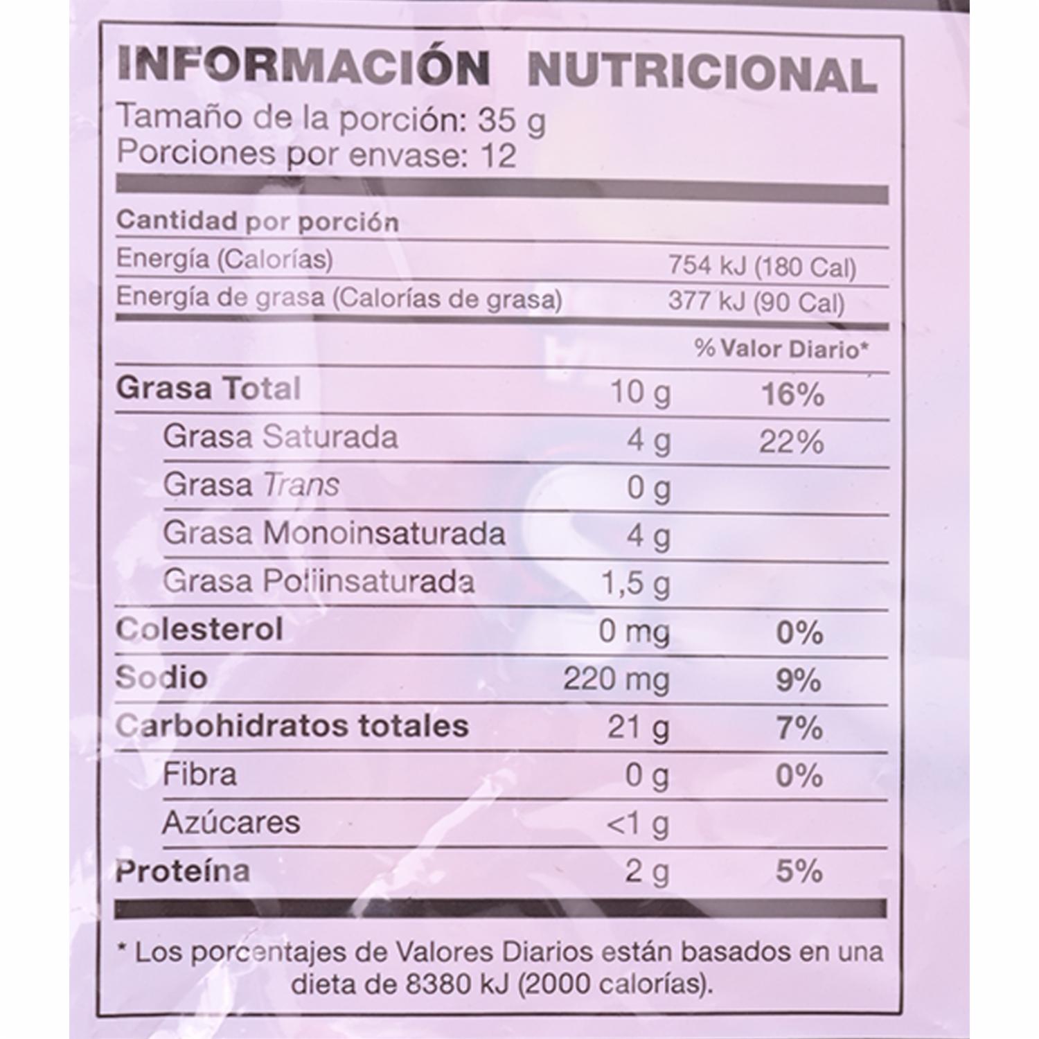- Sabor a queso intenso. - Textura crujiente. - Presentación en forma de bocaditos. - Alto contenido de carbohidratos y grasas. - Contiene gluten y lactosa