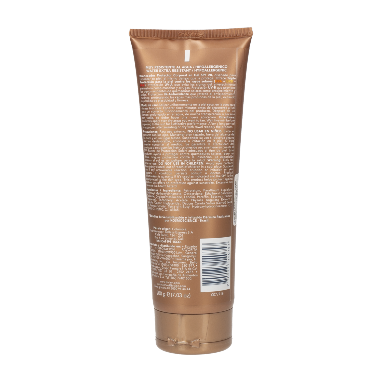 - - Es un producto que combina bronceador y protector solar en gel,- Contiene un activador de melanina, lo que ayuda a acelerar el proceso de bronceado,- Tiene un factor de protección solar (SPF) de 20, lo que lo hace adecuado para exposiciones moderadas al sol,- Es hipoalergénico, lo que significa que es menos propenso a causar reacciones alérgicas en la piel,- Al ser en gel, se absorbe fácilmente y no deja una sensación grasosa en la piel