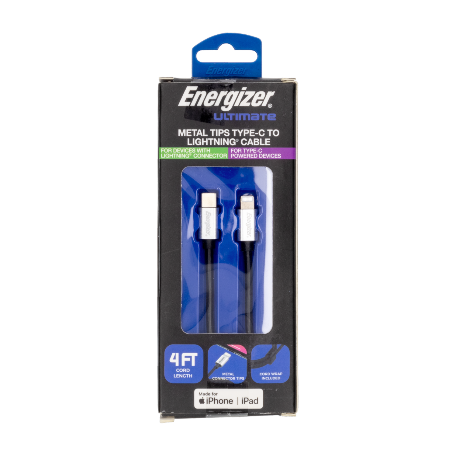- El Cable Lightning Tipo C de ENERGIZER, con puntas de metal y una longitud de 122 cm, ofrece una carga rápida y segura para tus dispositivos. Su diseño robusto y duradero asegura una larga vida útil, mientras que su velocidad de transferencia rápida proporciona una conexión eficiente para cargar y sincronizar tus dispositivos