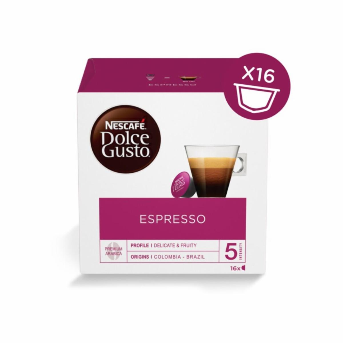 - Café Nescafé Dolce Gusto Espresso, un café de sabor intenso y lleno de aroma de los mejores granos de Robusta y Arábica, extraído con la presión perfecta para lograr una delicada capa de crema. Formato 16 Cápsulas