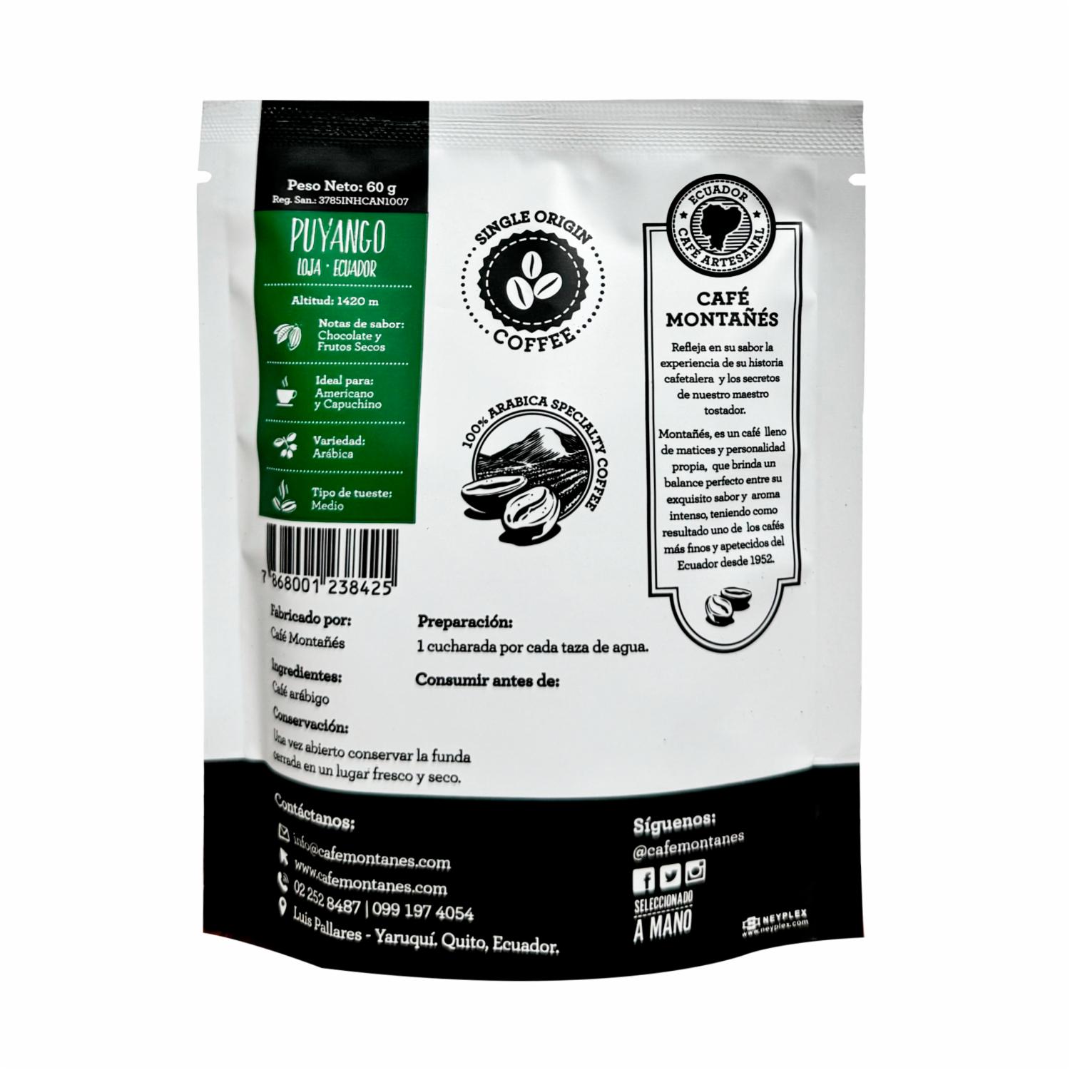 Café Tostado Y Molido Puyango MONTAÑÉS 60 G – MONTAÑÉS. Disponible en nuestros locales. Precio y stock pueden variar según la tienda.