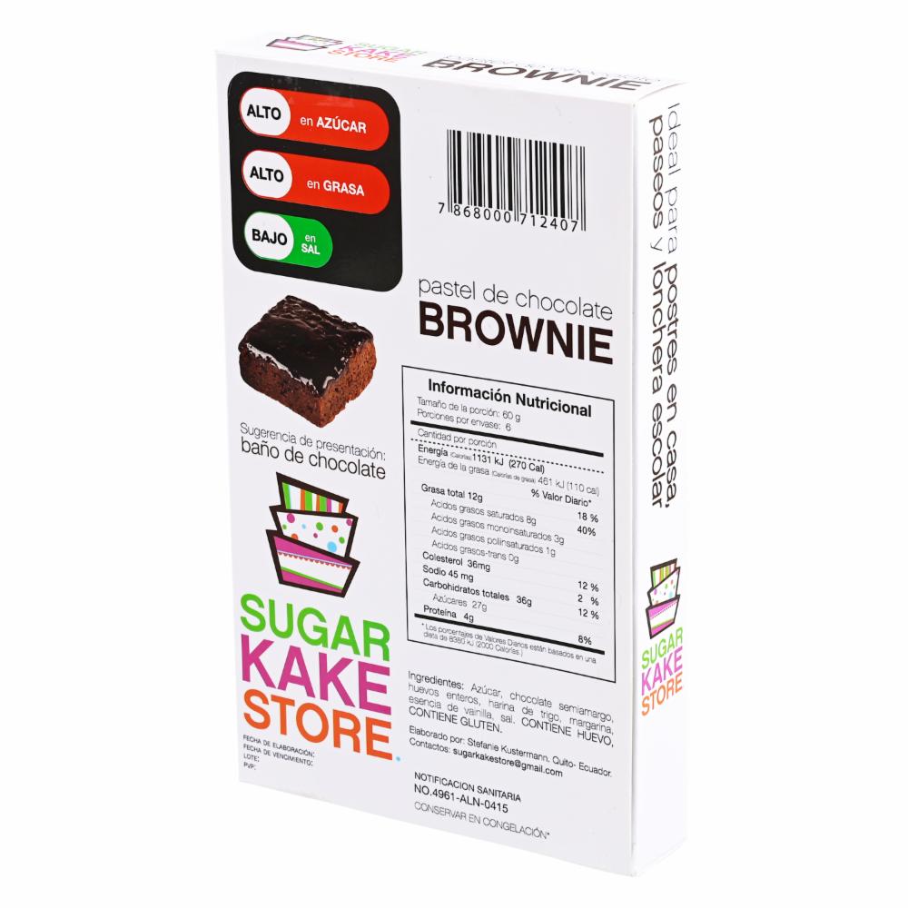 - Producto: Cake de Brownie - Marca: Sugar Kake Store - Propiedades principales: - Textura suave y esponjosa - Sabor intenso a chocolate - Elaborado con ingredientes de alta calidad - Presentación en porciones individuales o en tamaño grande para compartir - Ideal para acompañar con café o té, o como postre después de una comida