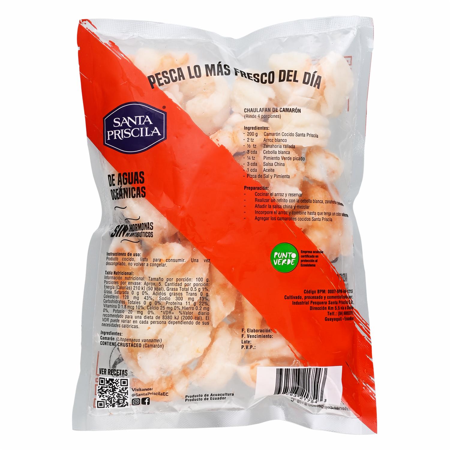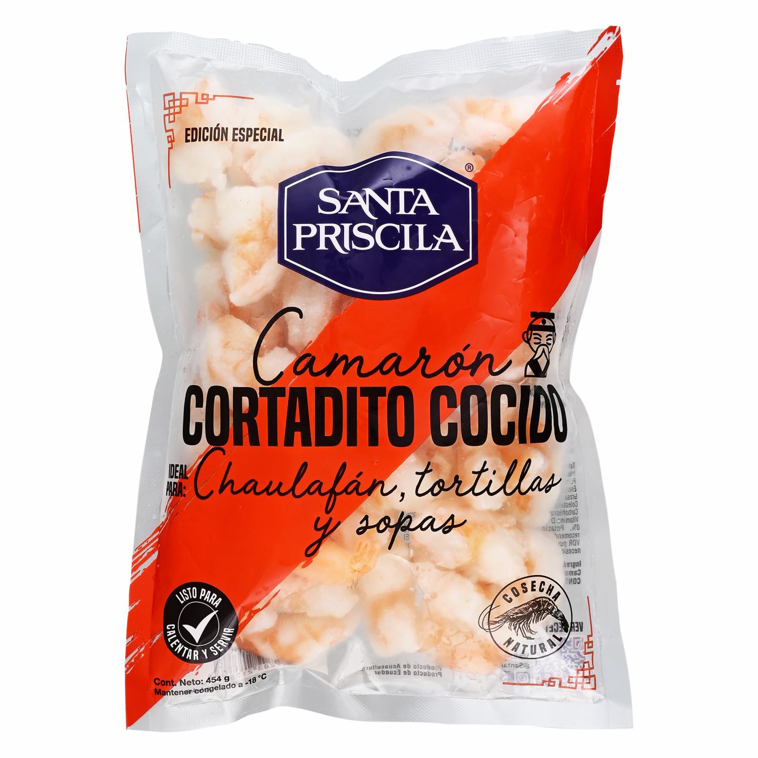 - Producto: Camarón cortadito cocido Santa Priscila Principal propiedad: Listo para consumir Otros atributos: Camarones de alta calidad, cortados en trozos pequeños, cocidos y listos para usar en recetas Presentación: Empacado en bolsas o bandejas selladas para mantener la frescura