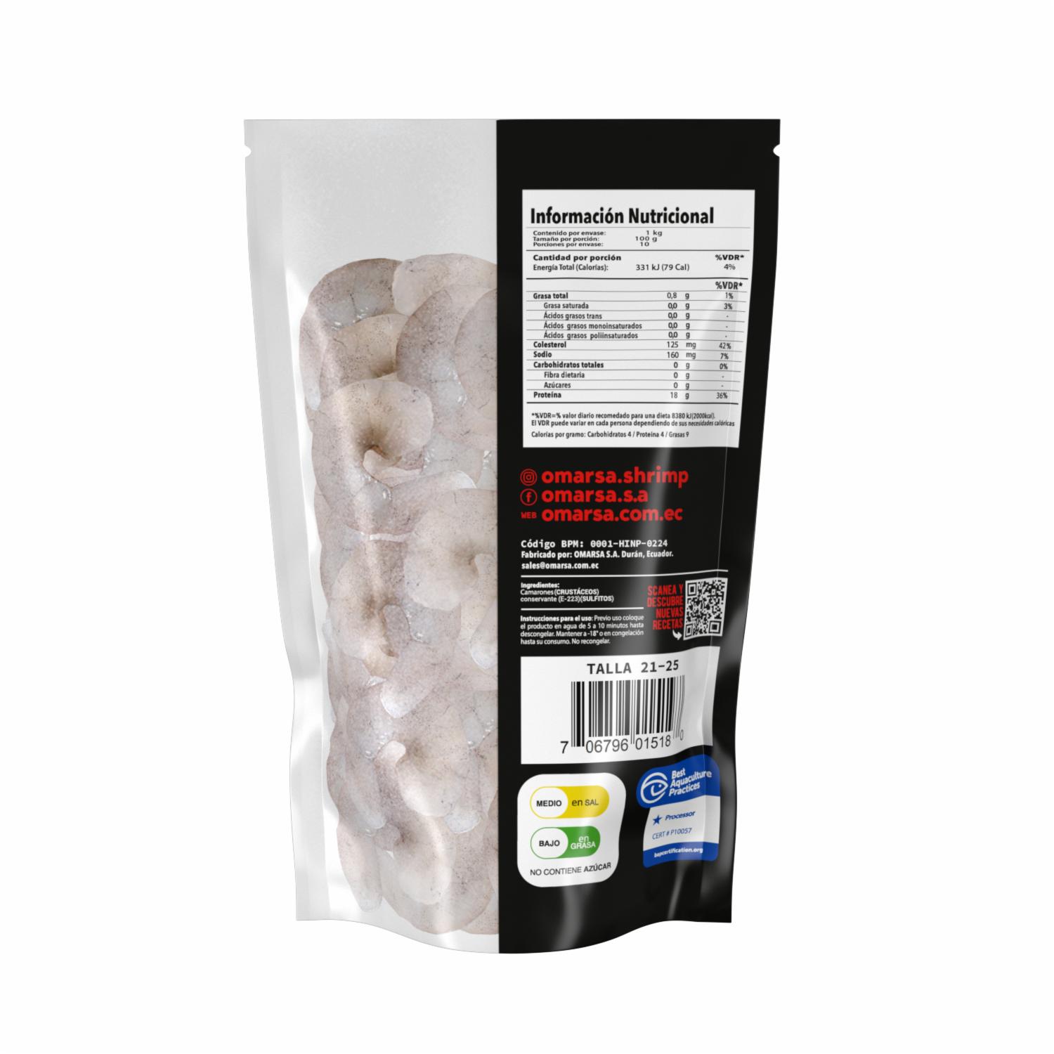 - Camarones Pelados y Desvenados Premium con calidad de exportación talla 21-25 , una super food fuente de proteína, no contienen antibióticos y solo necesitan 3 minutos en tiempo de cocción para no perder su textura y su delicioso sabor, lo puedes preparar en ensaladas, sopas, pastas, parrillas y más