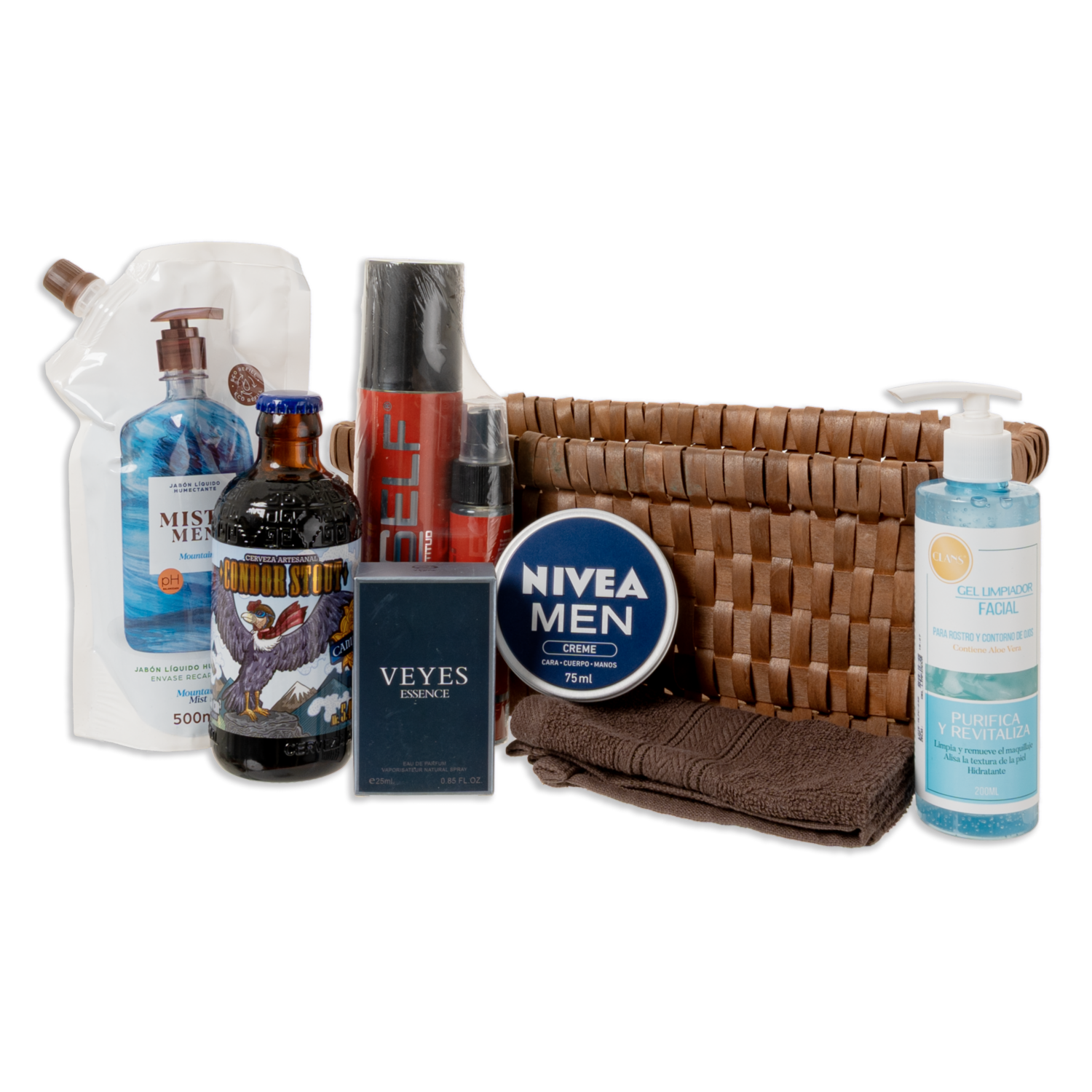 Incluye: - Cerveza Black Bird Stout CAMINO DEL SOL 296 Ml - Gel limpiador facial CLANS 200 Ml - Jabón líquido Men Mountain MISTY doypack 500 Ml - Body splash para hombre Mistery MYSELF 380 Ml - Crema facial para hombre NIVEA 75 Ml - Fragancia para caballero ESSENCE 25 Ml - Canasta pequeña café
