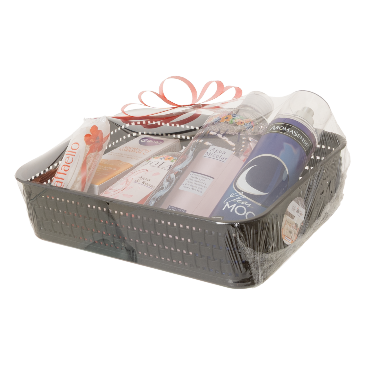 Incluye: - Splash AROMASENSE 250 Ml (fragancia de acuerdo a disponibilidad) - Sérum de Vitamina C GAMA 30 Ml - Agua de Rosas JOIA 250 Ml - Agua Micellar JOIA 400 Ml - Chocolate RAFFAELLO (3uds) - Canastilla Ratan grande
